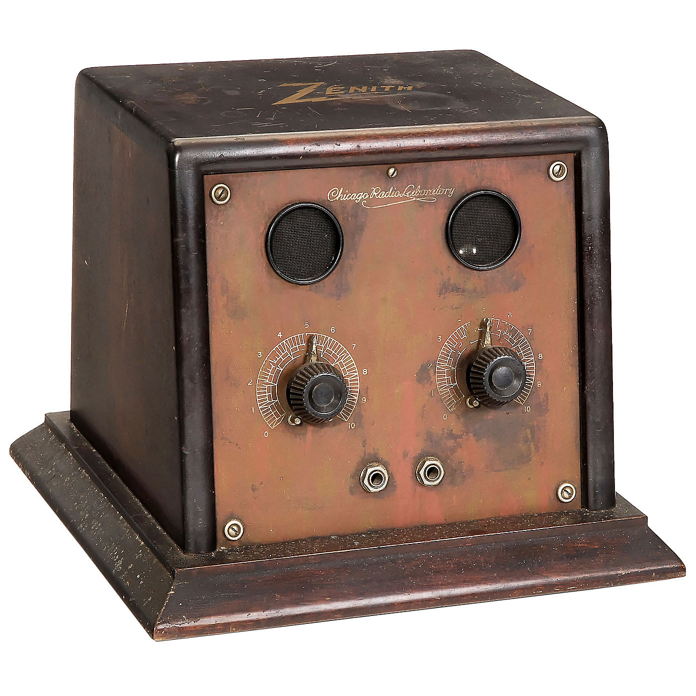 Chicago Radio Laboratory. 2 tubes, battery-operated, for headphones, wood case, complete with tubes.