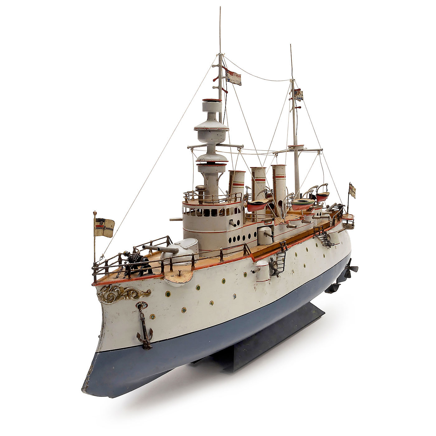 Gebrüder Bing, Nuremberg. Twin-screw steamer, 2-cylinder steam engine, metal hull and superstructure, extra fine hand-painted finish, equipped with 6 lifeboats, 2 anchors at chains and winds, 4 barbette guns, 4 guns in casements, 20 cannons, 4 dummy searchlights, 4 funnels, 2 masts with crow nests, detachable upper deck, length 32 in. - Very good original condition, without repair or retouch. - With German imperial war flags. The largest Bing boat in the 1909 catalog, No. 150/213. Deck retains original GBN decal, on stand with wheels.