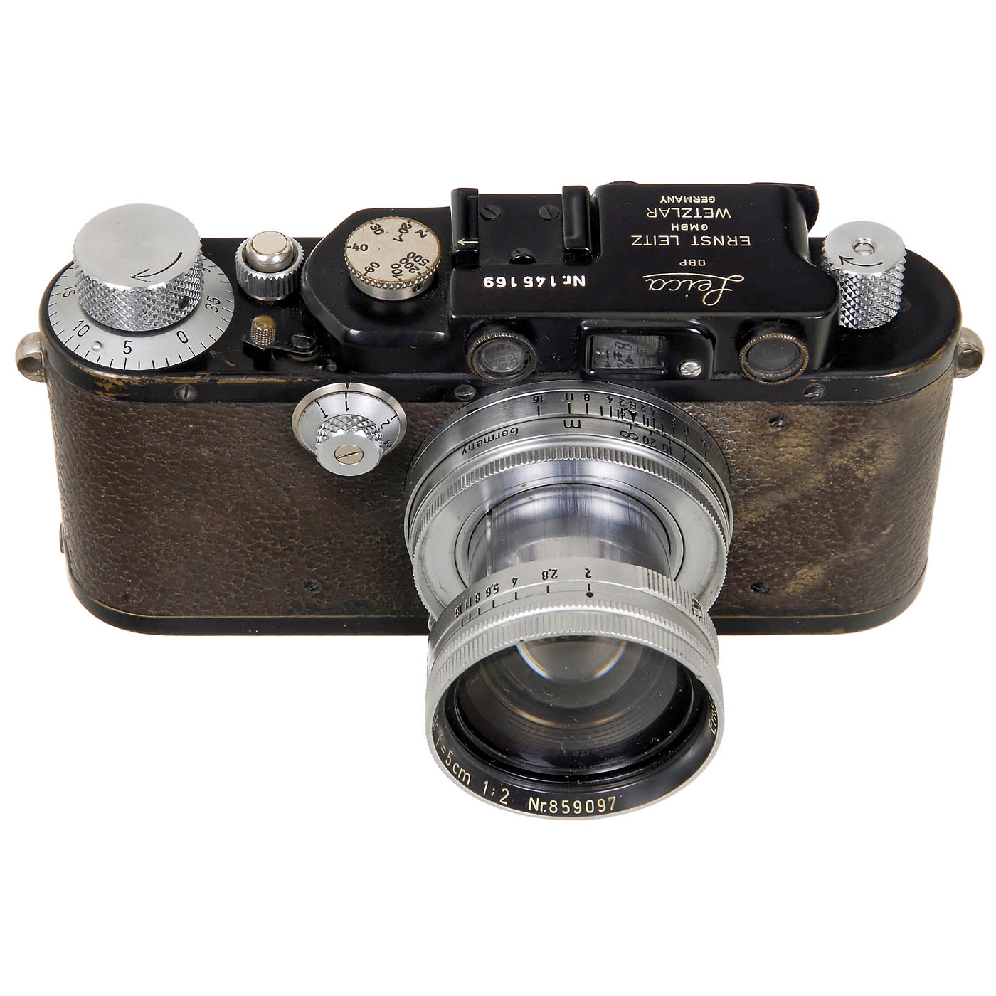 Leitz, Wetzlar. No. 145169, black-chromed, top plate new, engraving: "Leica DBP", with Summitar 2/5 cm, no. 859097, lens cap.