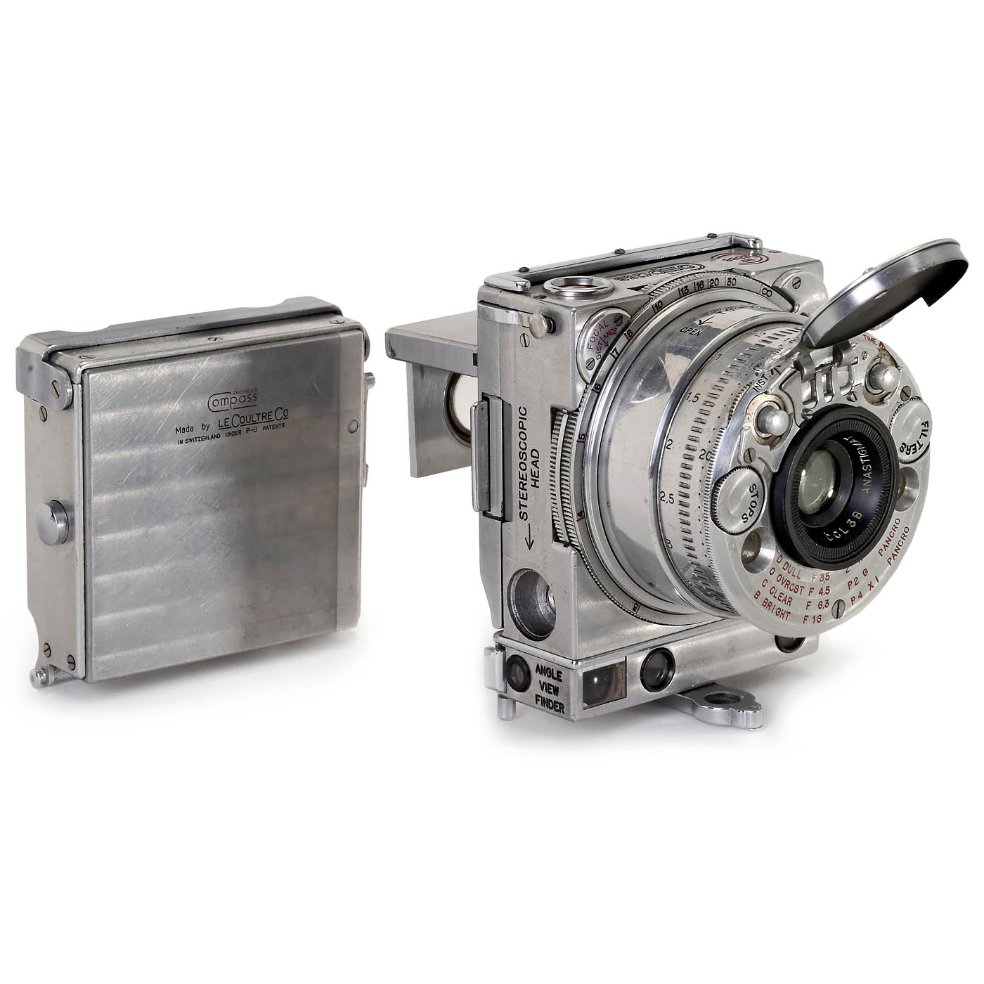 Le Coultre Cie., Switzerland, for Compass Cameras Ltd., serial no. 2388. Lens: Anastigmat 3,5/35 mm, type CCL 3B, English version, shutter works, coupled rangefinder, right-angle finder, light meter, for mono, stereo and panorama photography. With rare original rollfilm back and 2 original rollfilms. Excellent condition!