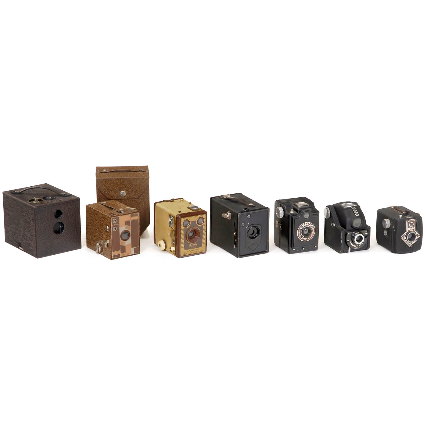 1) No 2 Bull's Eye Kodak. - 2) Kodak Beau Brownie No. 2, brown, with rare case. - 3) Kodak Brownie SIX-20 Model F, tan. - 4) Agfa Box 44. - 5) Agfa Box 50. - 6) Apparatebau Modell P56L. - 7) Bilora Blitz Box. - 8) Bilora Blitz Boy. - 9-10) Dacora Daci Royal, back and green. - 11) Ensign Ful-Vue, Model II, black, with case. - 12) Genos Rapid, without strap. - 13) Vredeborch Vrede-Box Standard Menis 49, green. - And: 14) Zeiss Ikon Baby-Box Tengor.