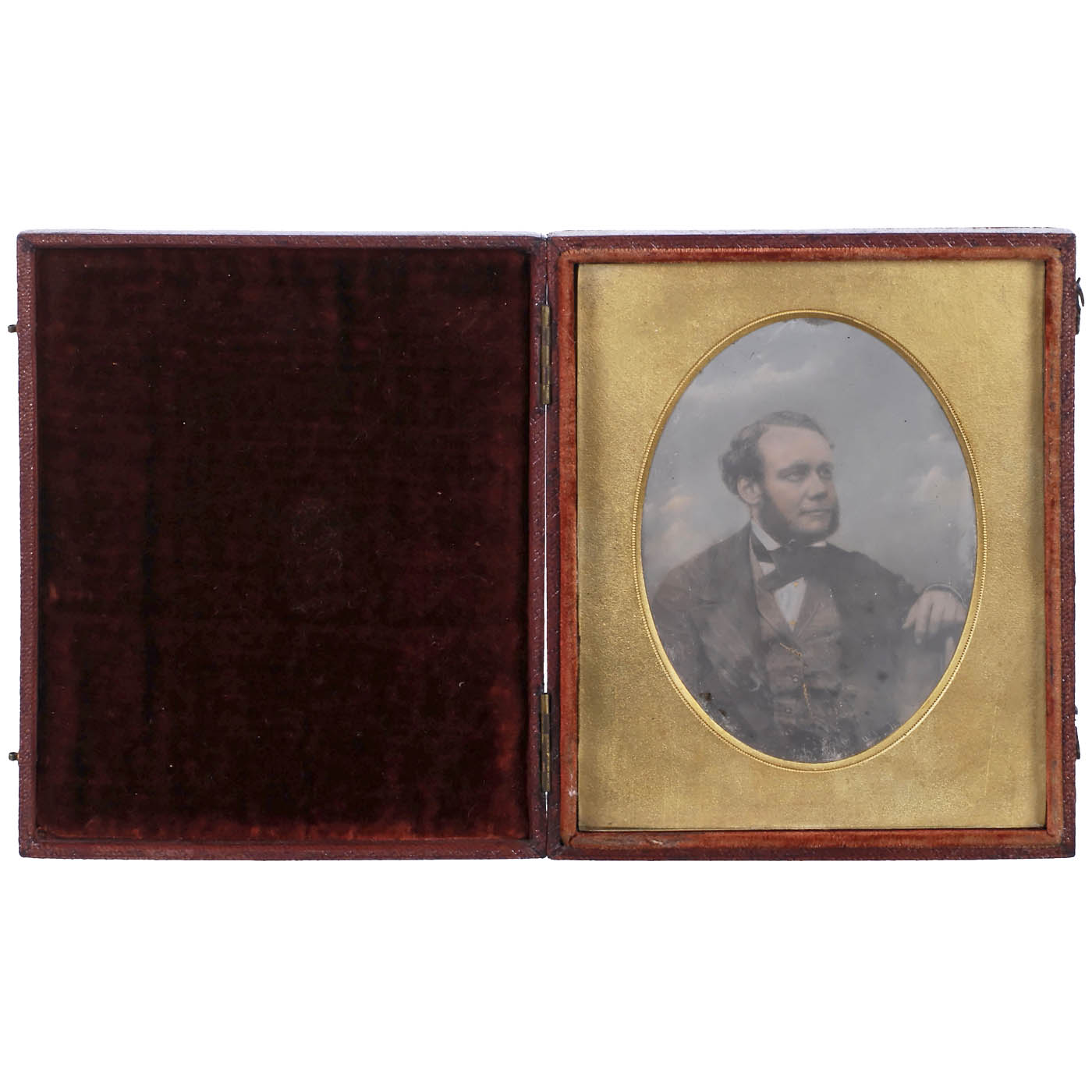 Case stamped: "Beard's Photographic Institutions, 85 King Willliam Street, London - 34 Church Street, Liverpool". Hand-tinted portrait of a gentleman, gold-tinted, ¼ plate, brass passe-partout, oval image section 3 ½ x 2 ½ in., excellent illumination and contrast.