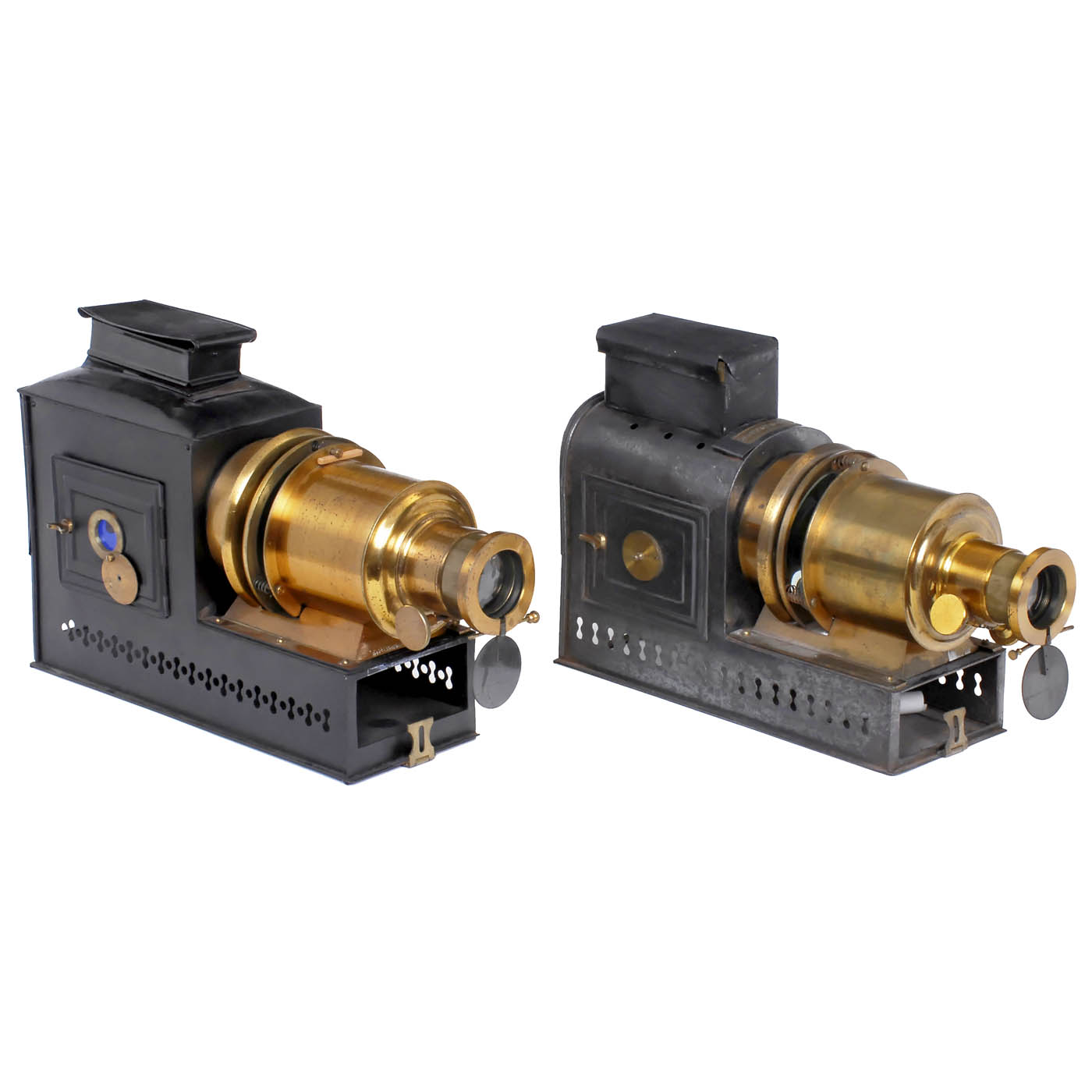 Lancaster & Son and Adams Co. For lantern slides with wood frame, tin bodies, length 17 in. and 17 ¾ in., height approx. 11 ¾ in. - In need of attention.