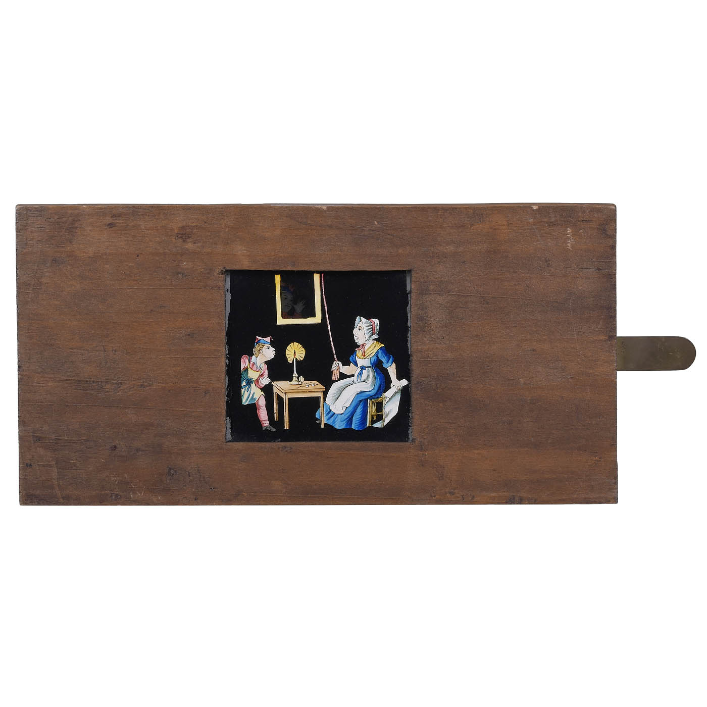 Presumably France. Wood frame size 5 x 10 in., picture size approx. 3 1/6 x 3 1/6 in., hand-colored.