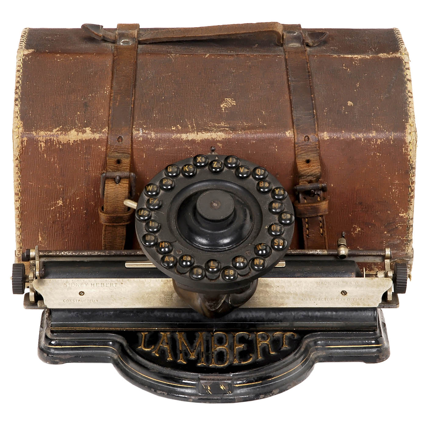 French licensed production by Sidney Hebert, Paris. In need of cleaning, keyboard disc glued, with original case. - One of the most attractive index typewriters!