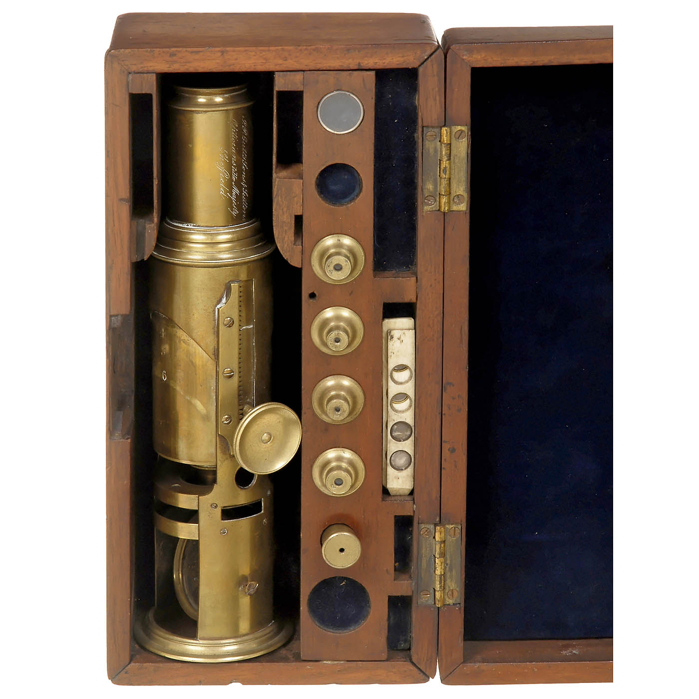 Signed "J.P. Cutts Sons & Sutton, Opticians to Her Majesty, Sheffield", England. Original lacquered brass, concave mirror, spring tension stage, stepped tube, 1 ocular, 4 objectives, rack-and-pinion focusing, height 10 in., with 2 bone specimen slides, in fitted mahogany case with compartment interior.