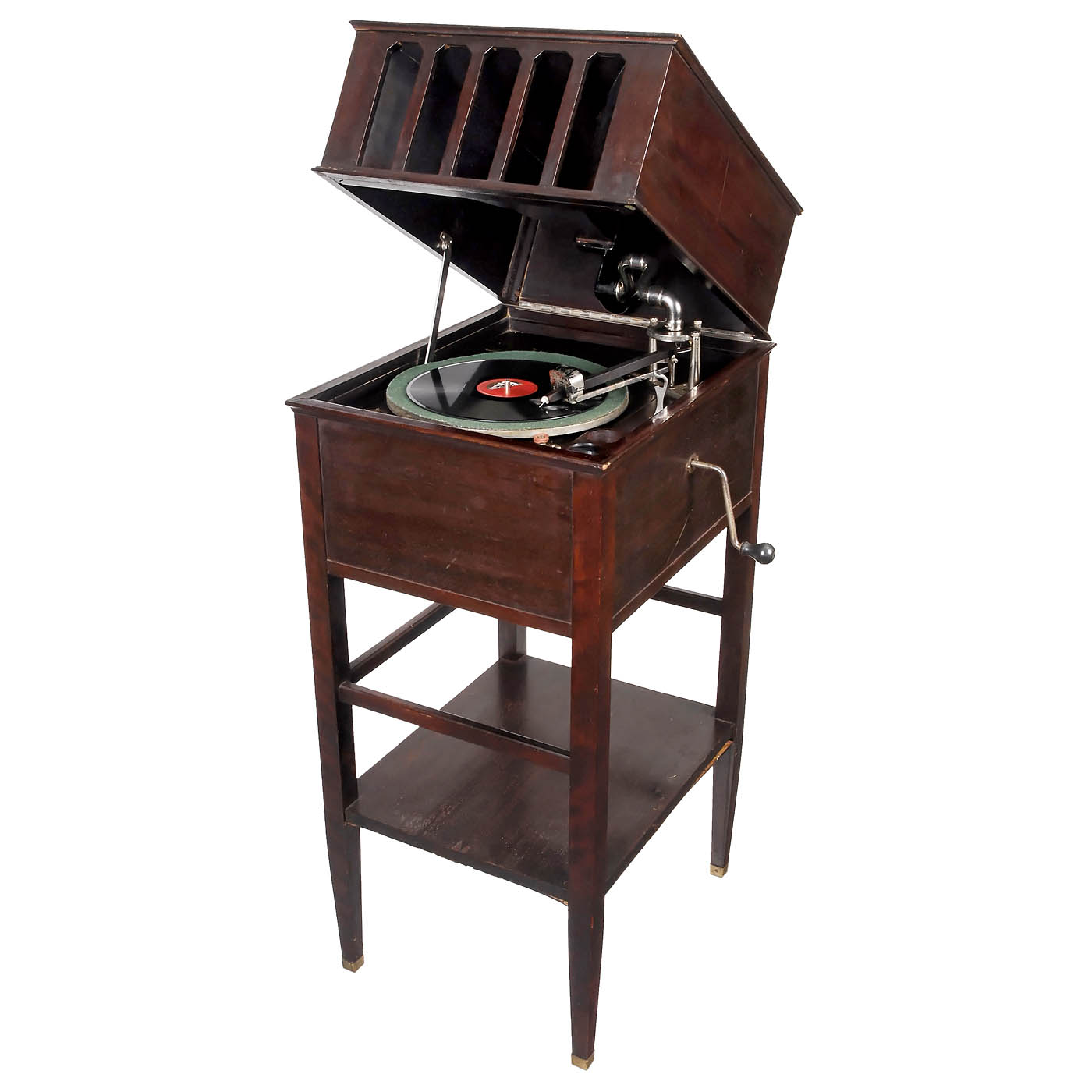 The Vitaphone Co., USA. No. 1154, wood tone arm, stationary soundbox, plays all discs with needle or jewel, horn in lid, mahogany case, size 17 x 20 x 41 in. A very rare gramophone with unique features. Working.