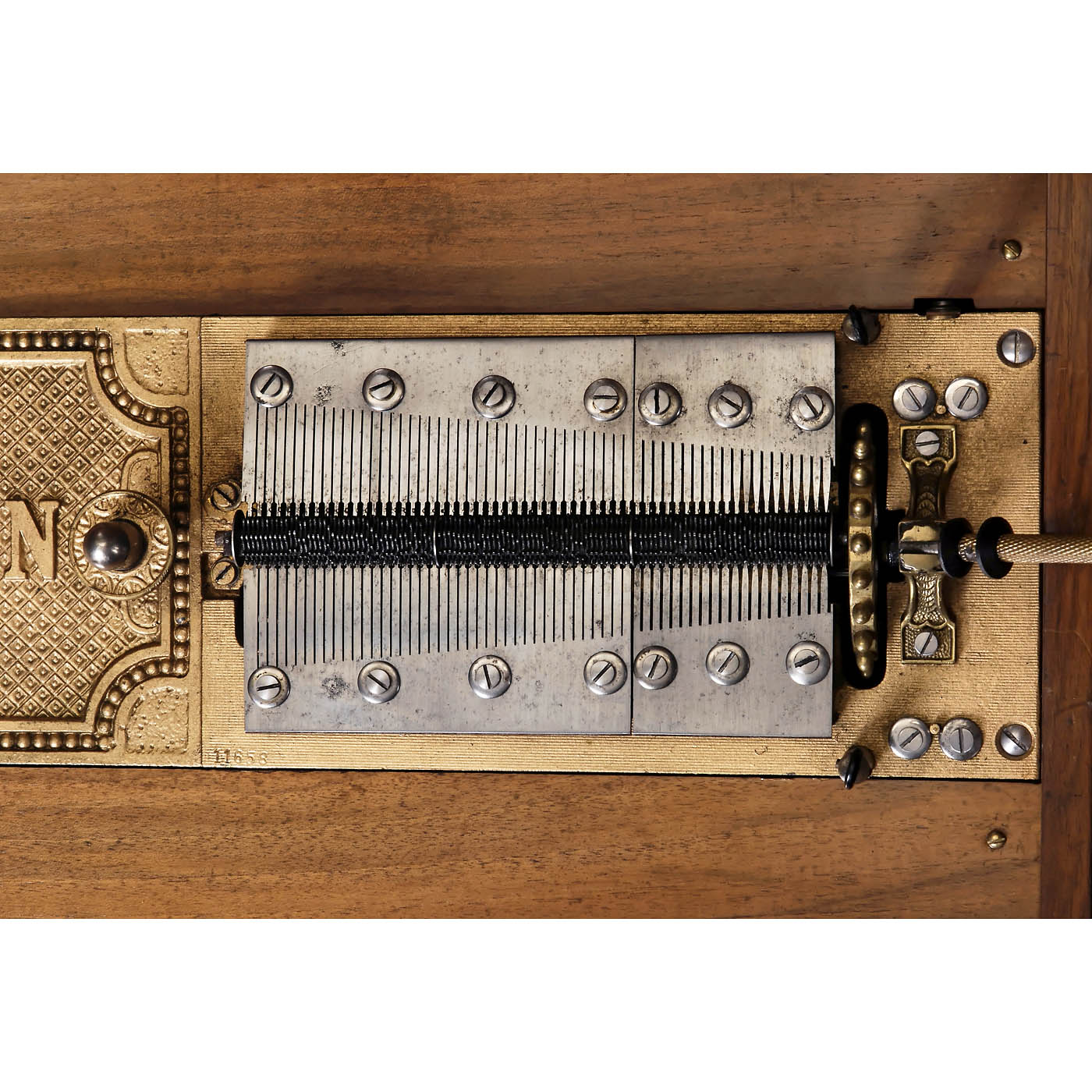 Manufactured by Polyphon Musikwerke, Leipzig. For discs of 19 5/8 in., 118 teeth in duplex comb (complete!), walnut case with inlays on the lid, original lithograph inside, with 15 discs and crank. - A superb collector's item and exhibition piece in excellent playing condition.