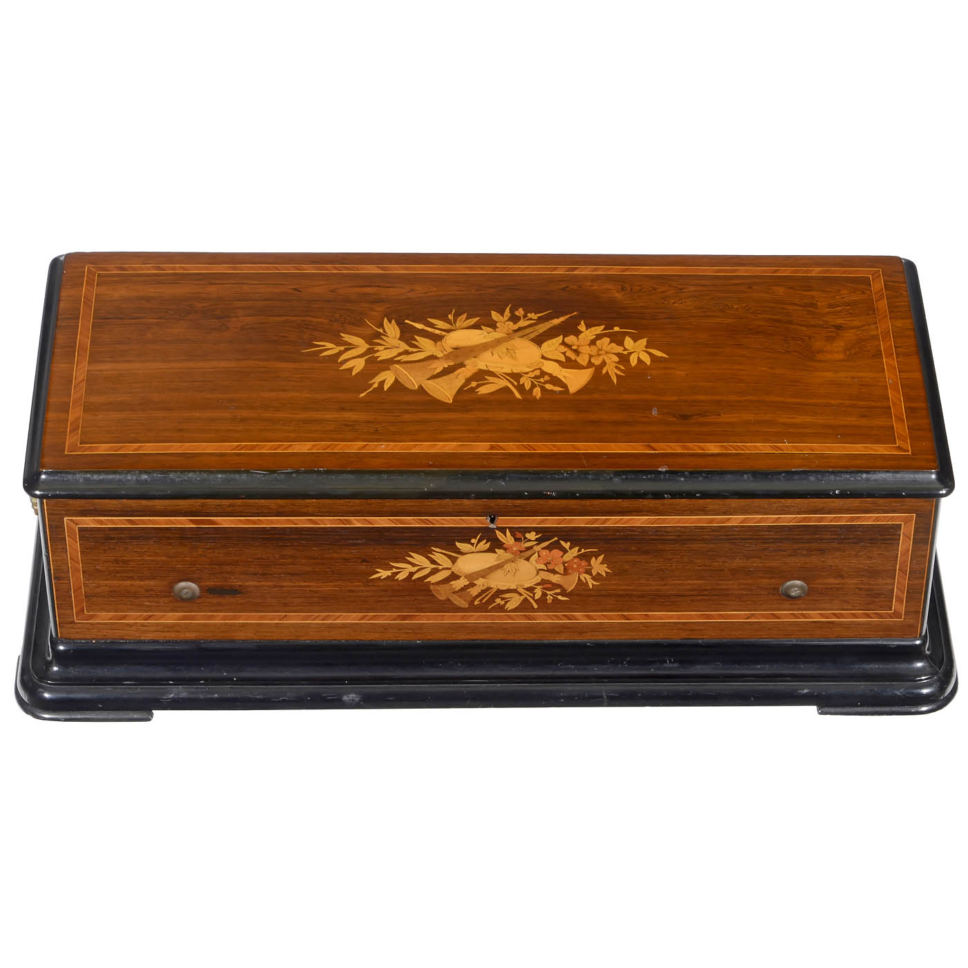 No. 47463, playing twelve airs on six revolutions, predominantly from "Messiah" by George Frideric Handel, Gamme No. 3334, with 139 teeth in two combs (complete), with double-spring motor, tune-sheet for retailer "Wales & Mc.Culloch, 32 Ludgate Hill, Londres" and veneered case with kingwood banding, decorative carrying handles and inlaid motifs of musical trophies on front and lid, wd. 27 ¾ in. (70,5 cm), cylinder 13 ½ x approx. 3 ¼ in. diameter (34 x 8,2 cm), good playing condition.