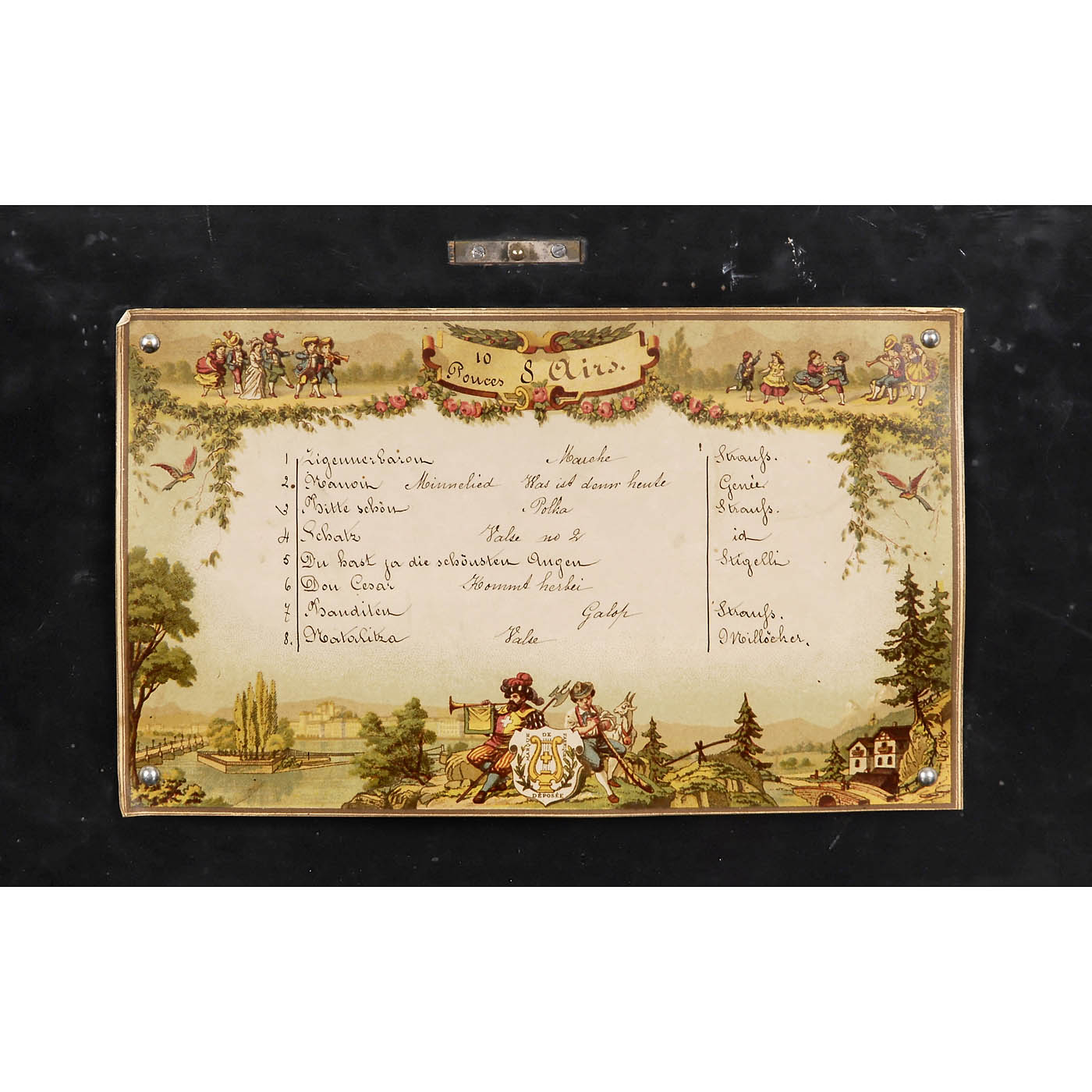 No. 22211, playing 8 dance airs, with 77 teeth in comb (one tooth visibly replaced, one tip off), "Isle Rousseau" tune-sheet and grained case with veneered and inlaid lid, wd. 20 ½ in. (52 cm), cylinder 10 ¾ in. (27,5 cm), governor noisy, would benefit from an overhaul.