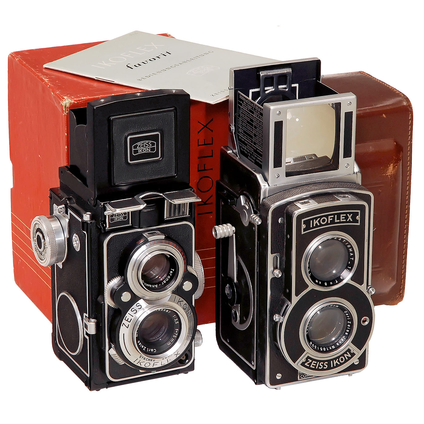 1) Zeiss Ikon, Dresden. Ikoflex III (853/16), c. 1938, no. B 35518, Tessar 2,8/8 cm in Compur-Rapid. – Excellent condition! (2/2) – And: 2) Zeiss Ikon, Stuttgart. Favorit 6 x 6 (887/16), c. 1956, no. N 2045, Tessar 3,5/75 mm in Synchro-Compur, built-in light meter (working well), with case, instruction manual and original box. Excellent + condition, near-mint! (1-/1)