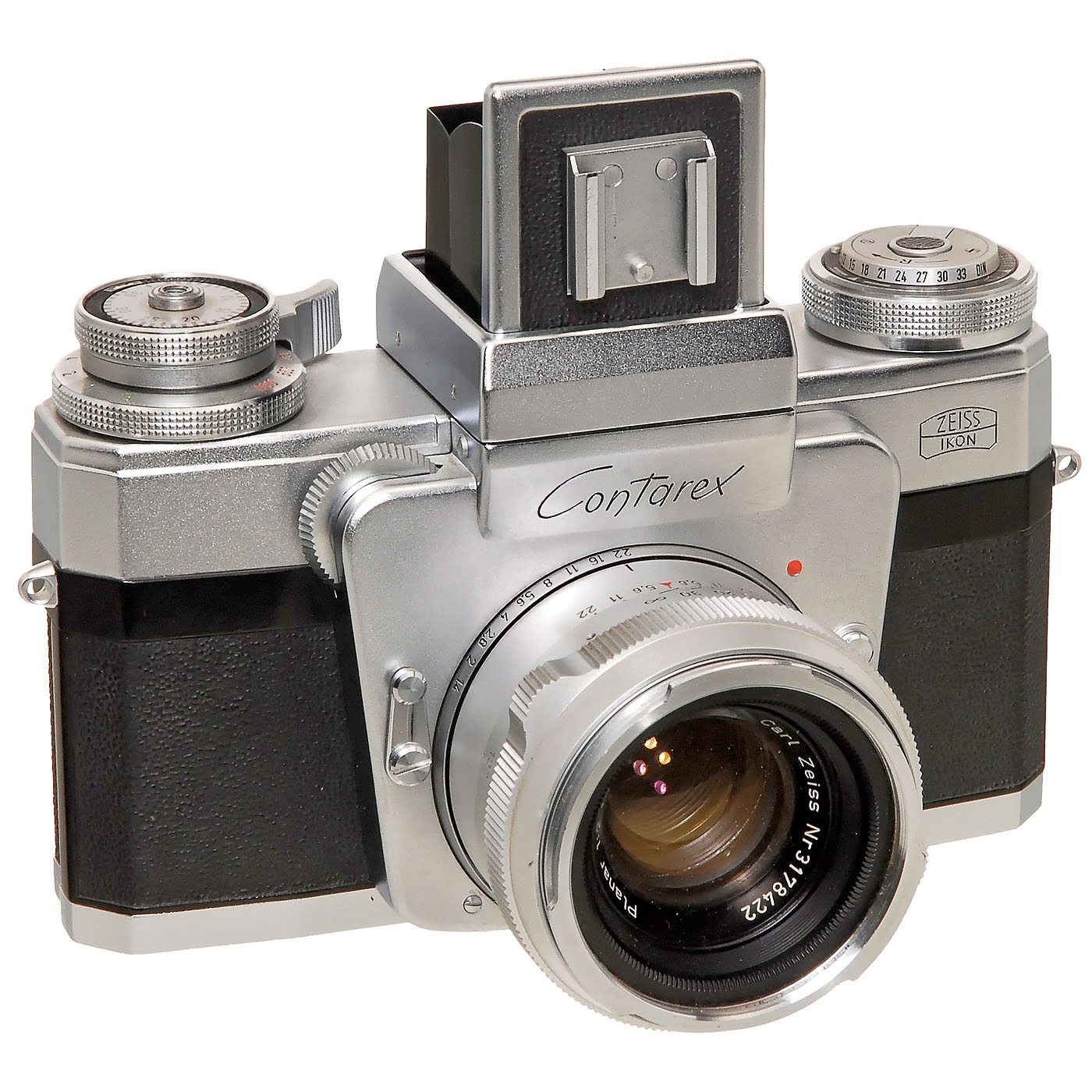 Zeiss Ikon, Stuttgart. No. U 24488, waist-level finder, Planar 2/50 mm, no. 3178422, long shutter speeds stuck. Body in excellent cosmetic condition. – In addition: Monocular 8 x 30 B, second version with front-end focusing, case and instructions for camera and monocular.