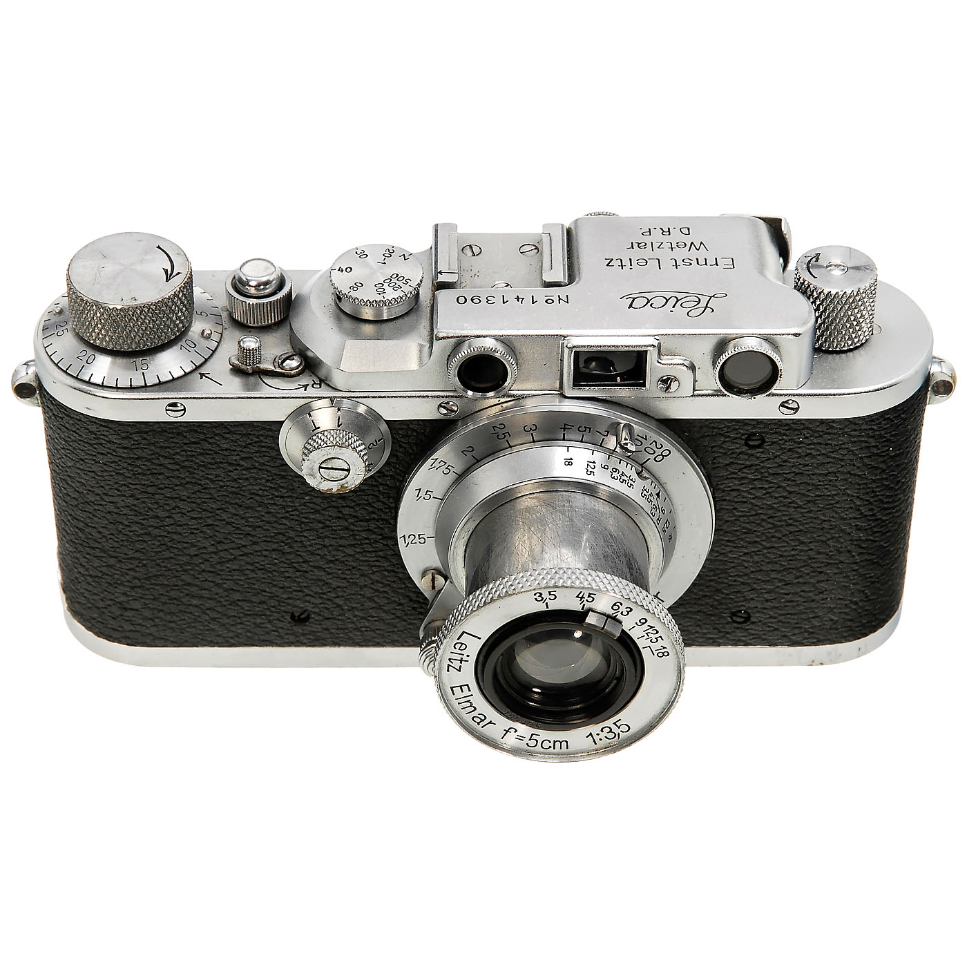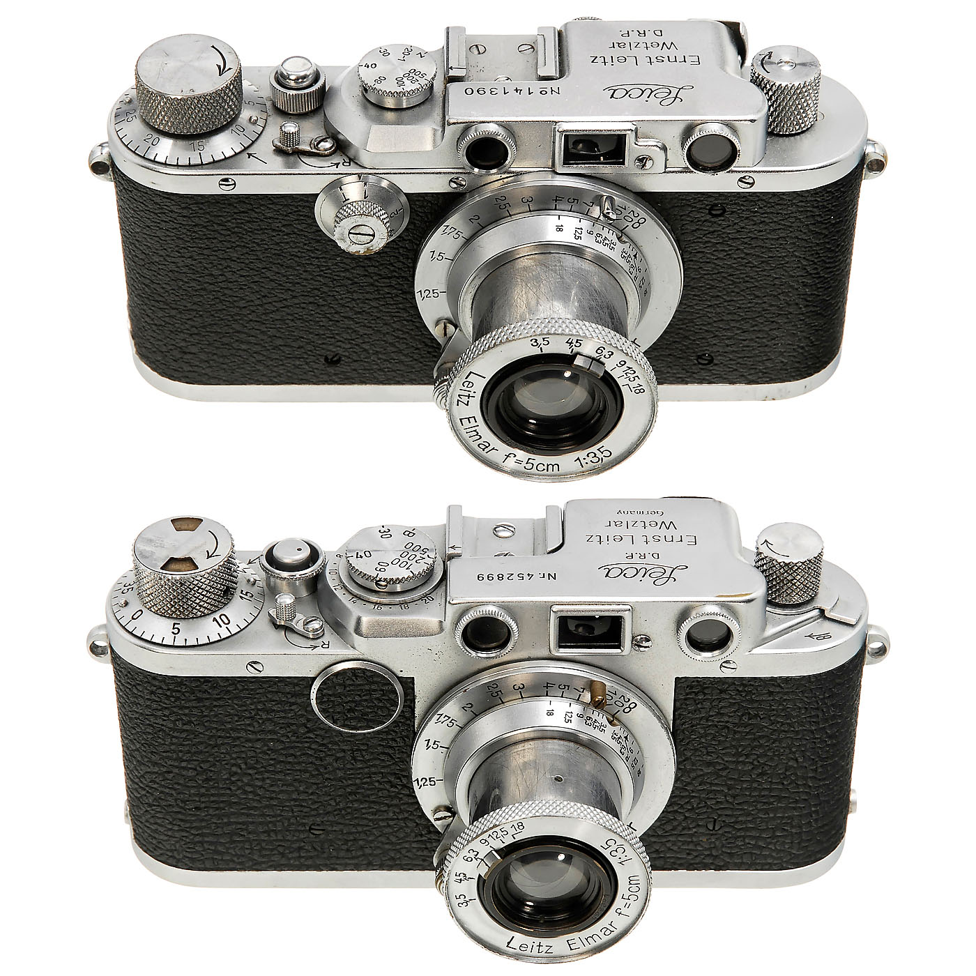 Leitz, Wetzlar. 1) Leica III (F), 1934, no. 141390, chrome, Elmar 3,5/5 cm, no. 360835. (3/2–3) – And: 2) Leica IIf, 1951, no. 452899, red-dial synchronization, shutter speeds uneven, Elmar 3,5/5 cm, no. 429621. (2-/3-)