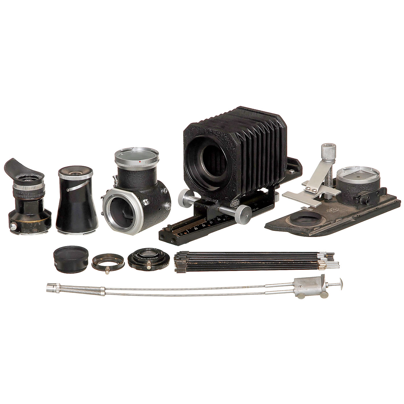 1) Universal bellows I UXOOR. – 2) Visoflex I with 5x loupe OZYXO and LVFOO, and other loupe. – 3) Leitz double cable release. – 4) Ring DOORX. – 5) Screw-mount ring. – And: 6) 2 copy tripods I and II for Elmar 5 cm (1 with lens). – In addition: Tableau with parts for Leica 25066.