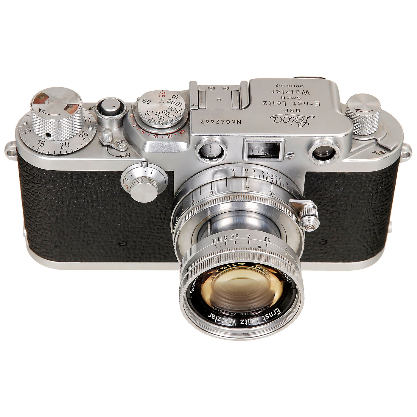 Leitz, Wetzlar. No. 647447, chrome, red-dial synchronization, version without selftimer. With Summicron 2/5 cm, no. 920092 (feet). – Excellent condition, near-mint!