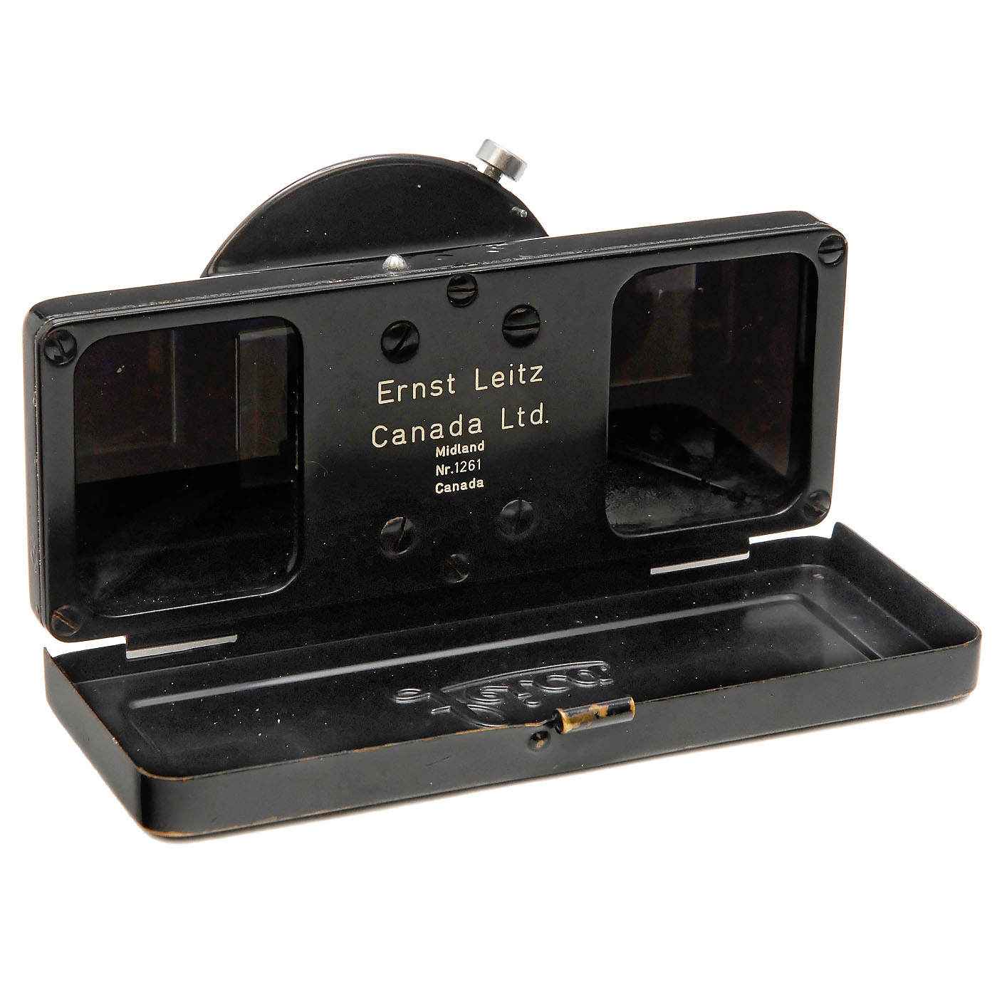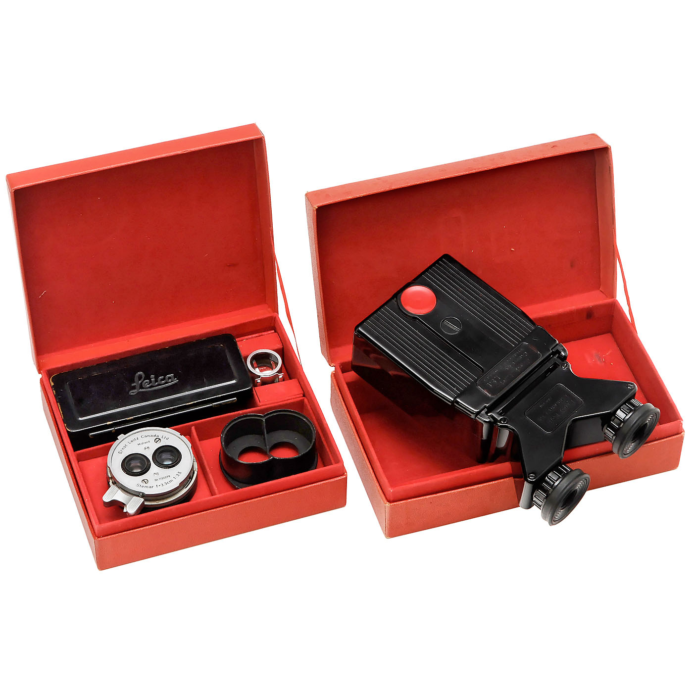 Leitz, Canada. Complete system for stereo exposures with M Leica OIRZO, Stemar 3,5/3,3 cm, no. 1124278, original box, prism attachment OIMPO with flap and rear cap (coating slightly patchy), brightline finder OIDYO, lens hood OIEGO and stereo viewer OTHEO with original box.