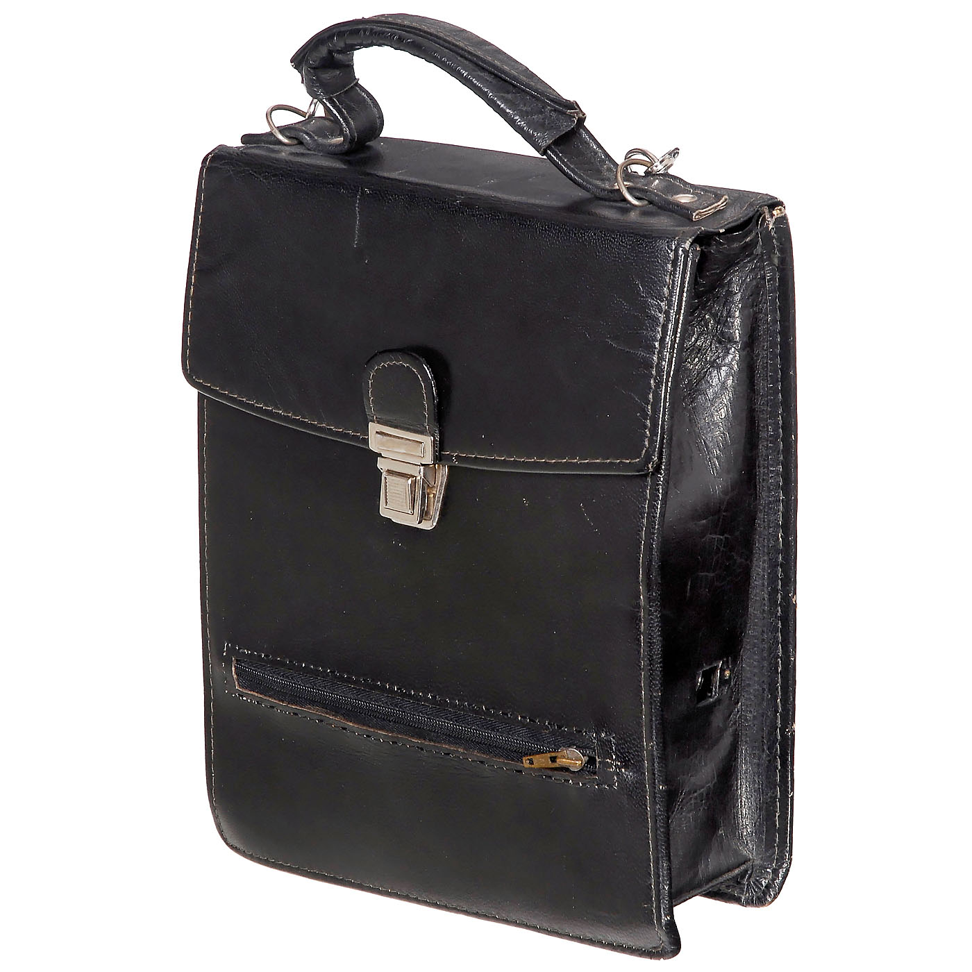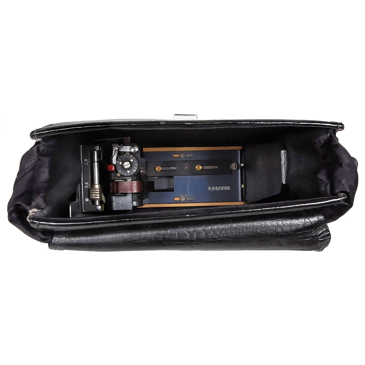 East German state security special camera "F-21" with clockwork drive in gentleman's bag, 18 pictures of 18 x 25 mm in special cassette, serial no. "KN829199" inside the bag, camera working. Size of the bag: 10 5/8 x 7 ½ x 2 ¾ in. (height x width x depth).