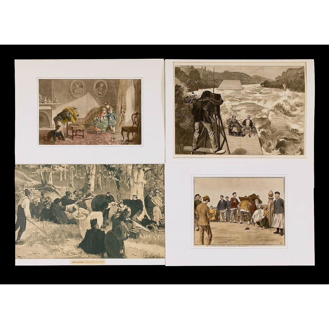 Predominantly Germany, some from England and France. Woodcuts, etchings, pen-and-ink drawings, colored autotypes and prints. Black-and-white and colored illustrations. Sizes between 16 x 20 cm up to 30 x 45 cm, all with passe-partout mounts. – Excellent condition!