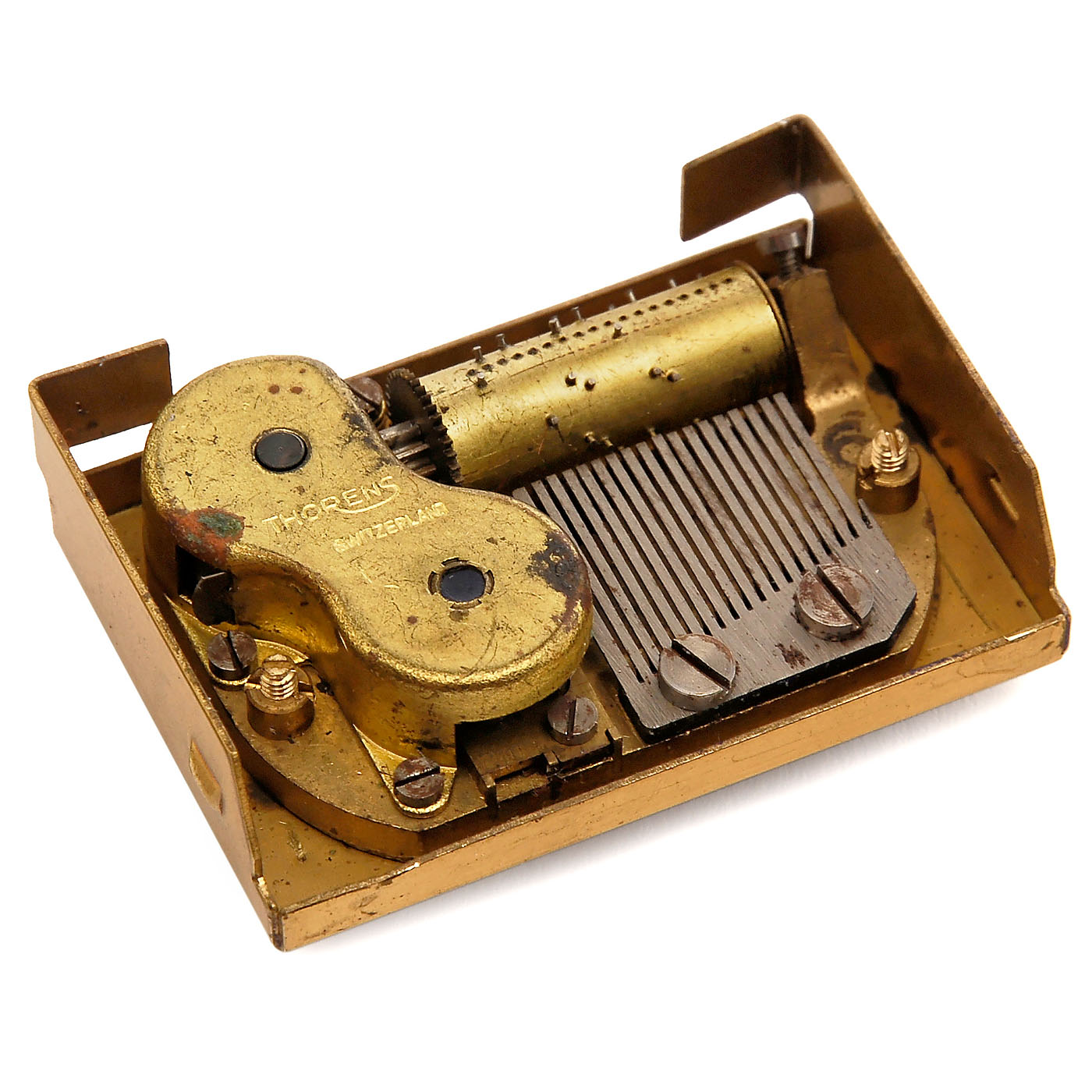 Cigarette case in form of a Kodak Vest-Pocket camera. Brass body with blue-lacquered decoration, one side a cigarette box, the other with powder box and musical movement by Thorens, Switzerland (working), size: 4 x 2 x 3/5 in. – Very rare combination of a "Camera-Pack"!