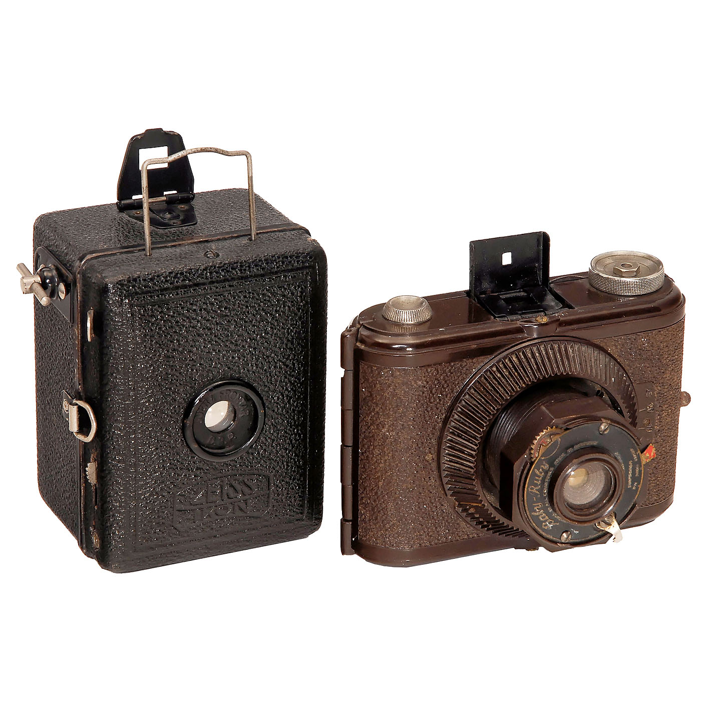 1) Ihagee, Dresden. Klein-Ultrix 3 x 4 cm, 1931, model without strap lugs (produced for only half a year), film type 127, Ihagee-Anastigmat 4,5/50 mm in Compur. (3/2–3) – 2) Certo Camerawerk, Dresden. Dolly 3 x 4 cm, 1931, Certar 2,9/5 cm in Compur. (3/3-) – 3) Ruberg & Renner, Hagen. Baby-Rubby, c. 1933, brown bakelite, 3 x 4 cm, rare! (3/3-) – And: 4) Zeiss Ikon, Dresden. Box-Tengor (Baby-Box 54/18), 1930, Frontar 1:11. (2/2)
