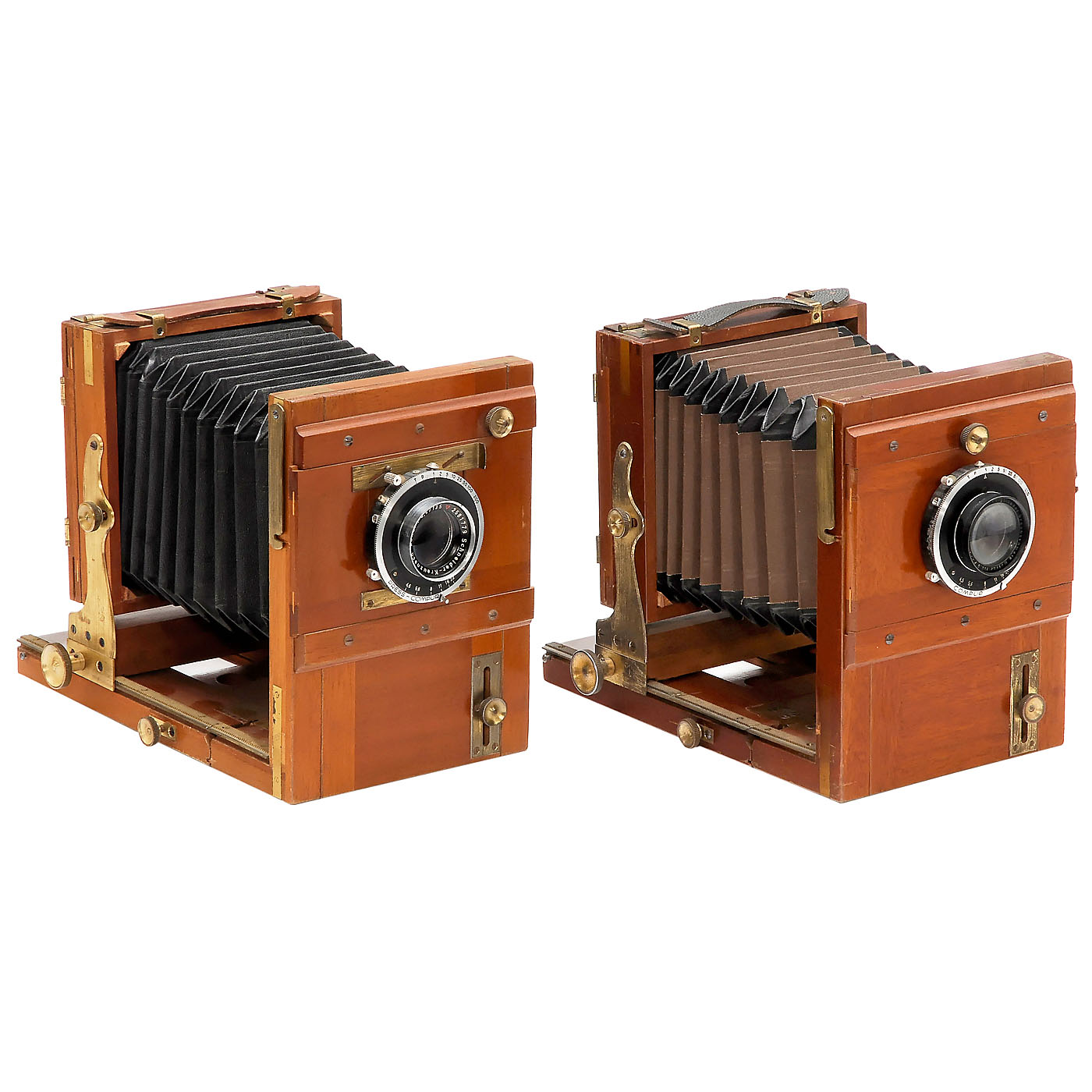 Presumably by Ernemann, Dresden. "Globus" series, size 13 x 18 cm, various models, polished wood with brass fittings, black and brown bellows with black corners, lenses: Schneider Xenar 4,5/135 mm and Voigtländer Heliar 4,5/15 cm, Compur shutters, focusing screen backs.