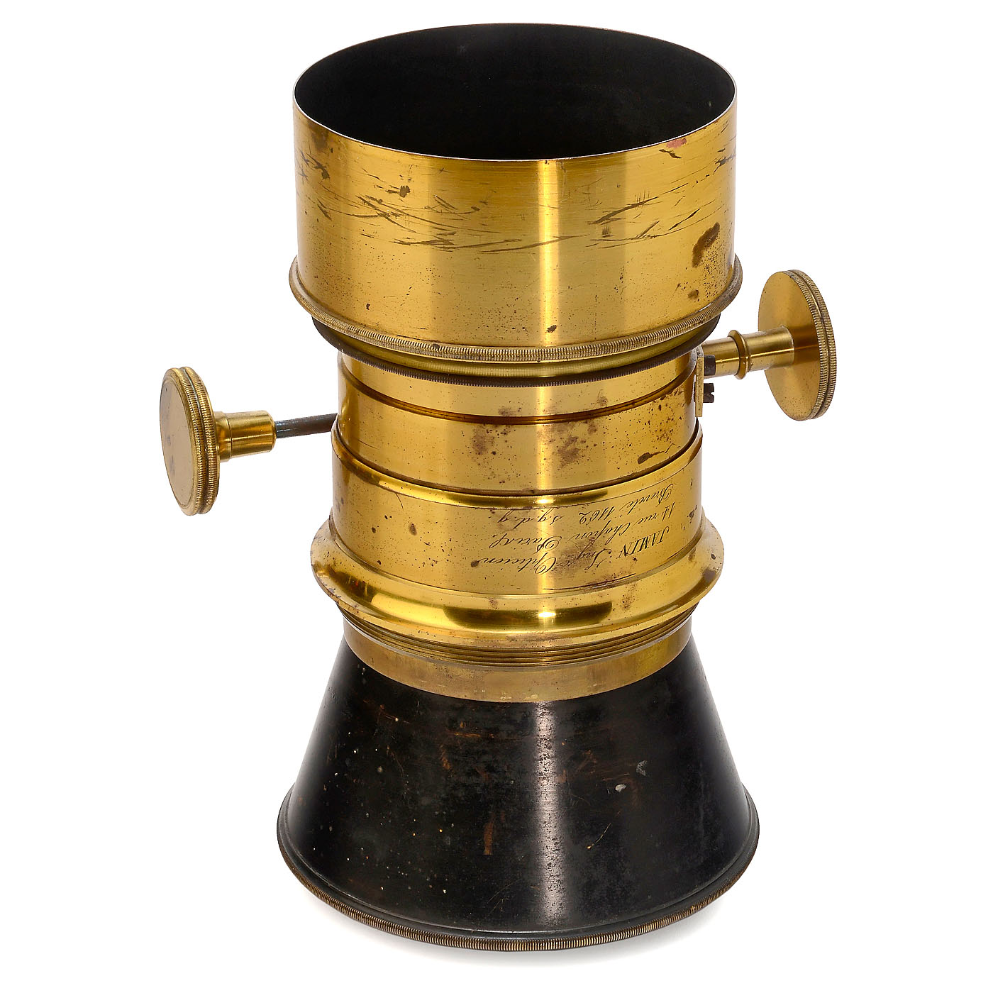 JAMIN Ing. Opticien 14 rue Chapon Paris Breveté 1162 s.g.d.g. Successor of the legendary lens "à Cône Centralisateur" from 1855, which was first presented by Jamin at L'Académie des Sciènces in Paris. Approx. 13 ¾ in. focal length. Front optics marked "C. Paysage", back marked "A". Rack-and-pinion focusing (working), height of the lens: 9 in., front optics diameter 2 ¾ in., lens with one round diaphragm. – A sensational collector's item and exhibition piece of museum quality! – Literature: Corrado D'Agostini, "Photographic Lenses of the 1800's in France", p. 204 (left side).