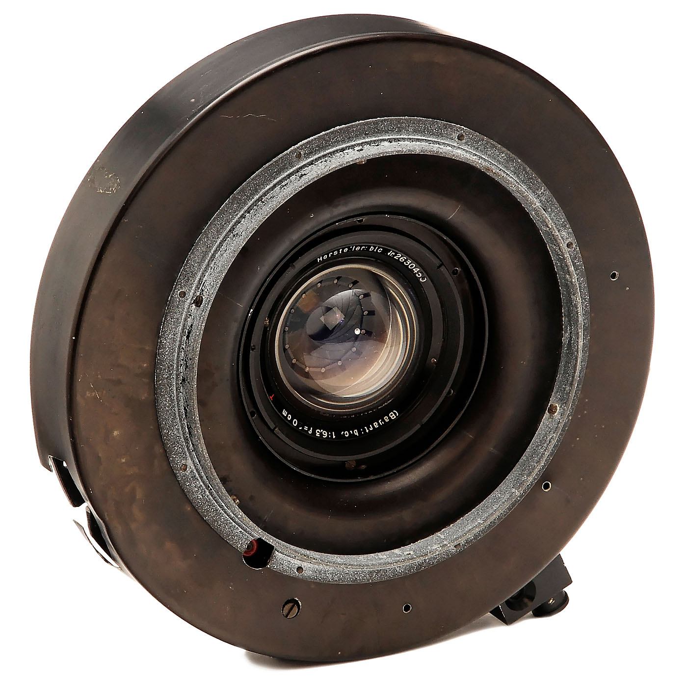 Carl Zeiss, Jena. Special lens for air force use, engraved: "(Bauart: Blc) 1:6,3/20 cm T Hersteller: Blc Nr. 2630450", in central shutter (not tested), rear glass with scratches, lens diameter 4 1/3 in., with shutter Ø 11 in. – In addition: Zeiss "Messfarbfilter" yellow. – One of the first lenses with "T" coating, only made for the military!