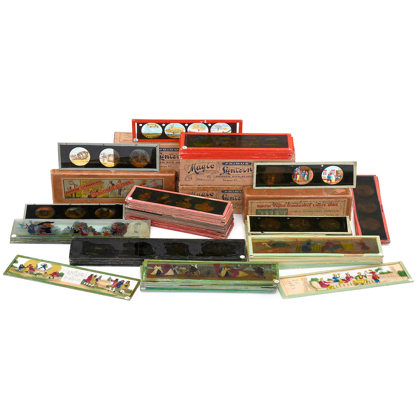 Predominantly England and France. Panoramic slides and strips, depicting comical scenes, fairy tales and more. 6 series with boxes (not all complete), a few damaged.