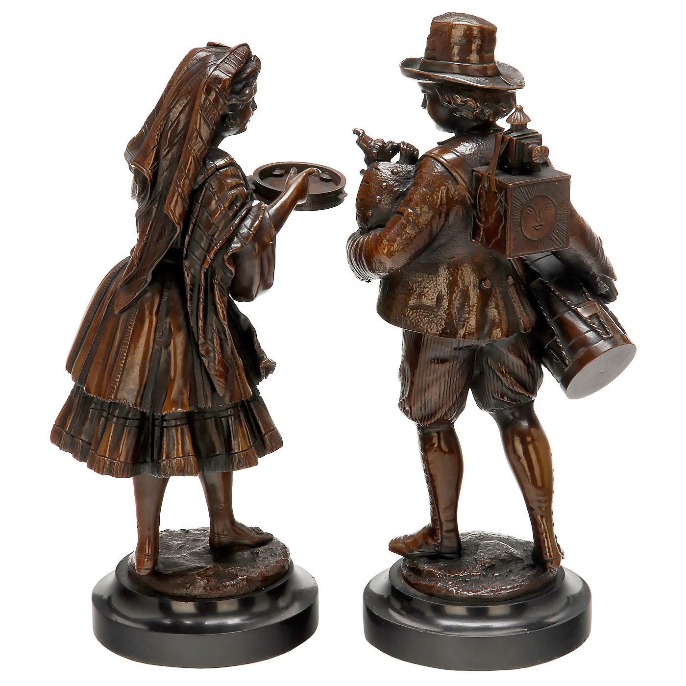 Depicting a Savoyard showman with monkey and drum, a magic lantern outfit upon his back and a female musician with tambourine, on circular bases, height tallest 10 ¼ in. (26 cm), professionally cleaned and repatinated. – We know of only three other examples of this figural pair: two in private collections in France and England, one in a Swiss museum. – Rare bronzes, with fine crisp casting and an appealing theme.