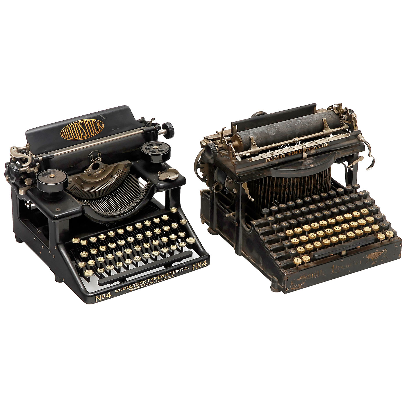 1) Smith Premier No. 2, 1897, no. 17409, very popular American upstroke machine with full keyboard, carriage in need of adjustment, with metal cover. - Literature: Martin, 1949, p. 109. (3/4) - 2) Clemens Müller A.G., Dresden. Urania, 1921 onwards, no. 31977, carriage escapement defective. (3/4) - 3) Woodstock Typewriter Company, USA. Woodstock No. 4, 1915 onwards, no. 3637556. (2-3/2-3) - And: 4) L.C. Smith & Bros. Typewriter Company. L.C. Smith No. 8, 1915 onwards, no. 360680. (3-4/3)