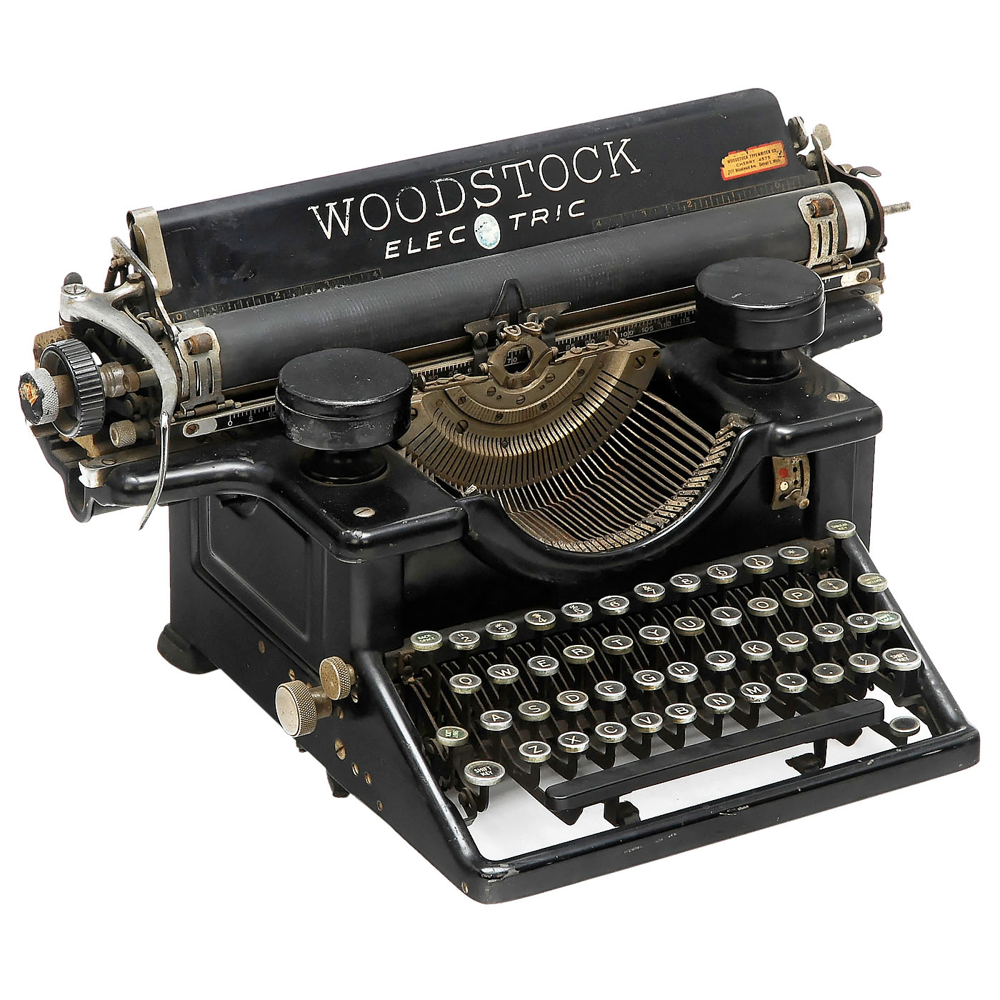 No. E14-495202E, Woodstock Typewriter Company, USA. Typebars and shift keys are powered by small General Electric external motor, the carriage return is manual.
