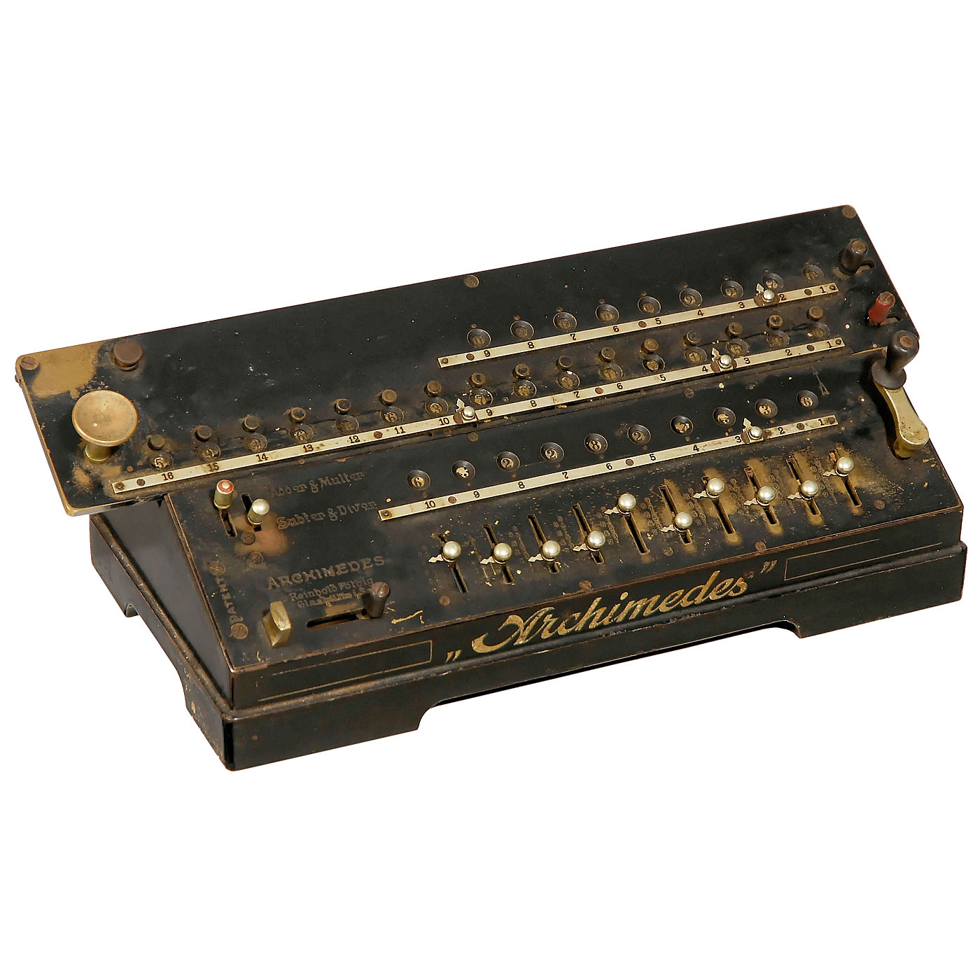 German brass stepped-drum calculating machine for all 4 arithmetical operations, by Reinhold Pöthig, Glashütte, Saxony. Early model with serial no. 3710. 10, 9 and 16 digits. - Literature: Martin, p. 191. - One of the great and important calculators, in original condition. - Extremely rare! Mechanism sticking, in need of cleaning, one keytop missing.