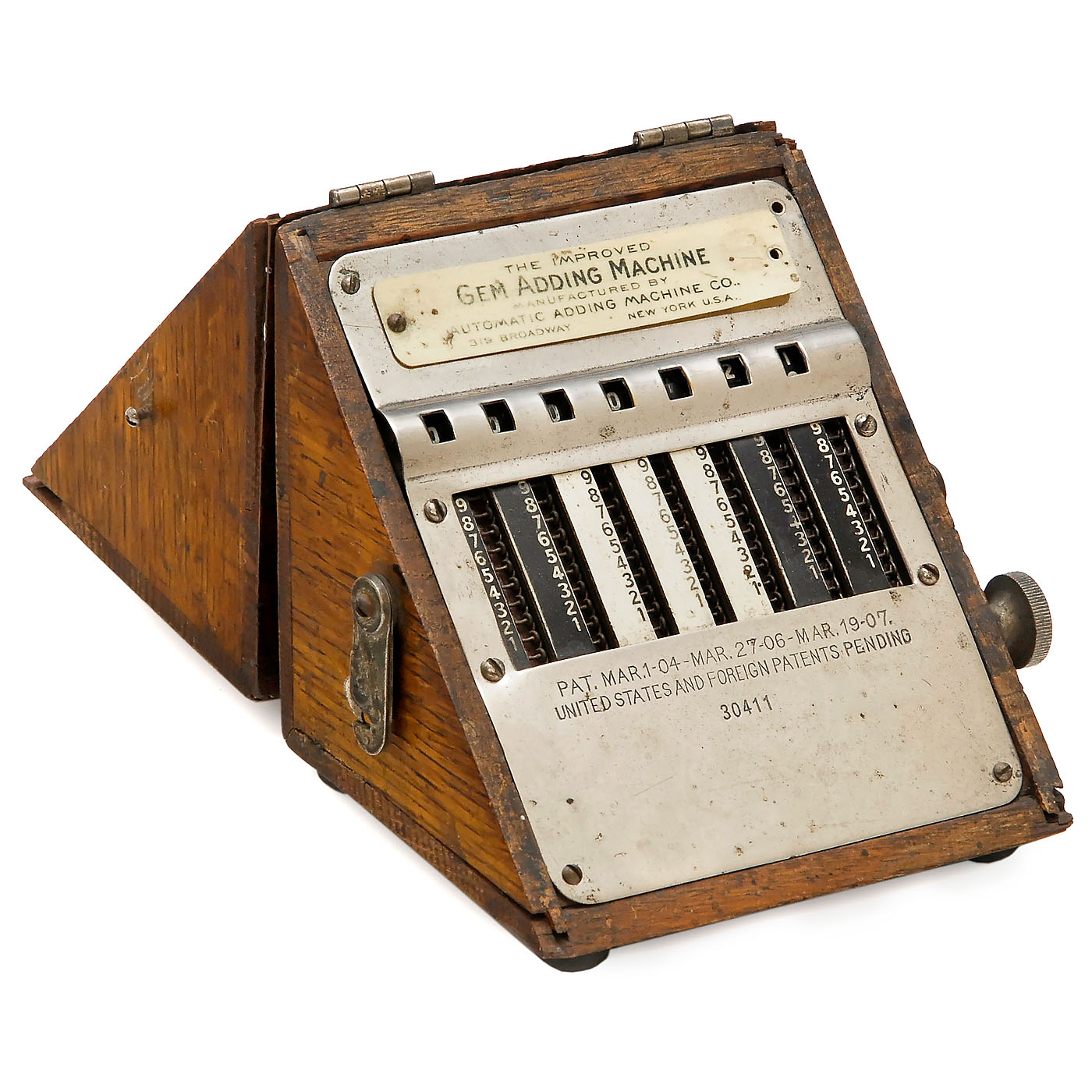 Manufactured by The Automatic Adding Machine Company, New York. American stylus-operated chain adder, serial no. 30411, in attractive oak case.