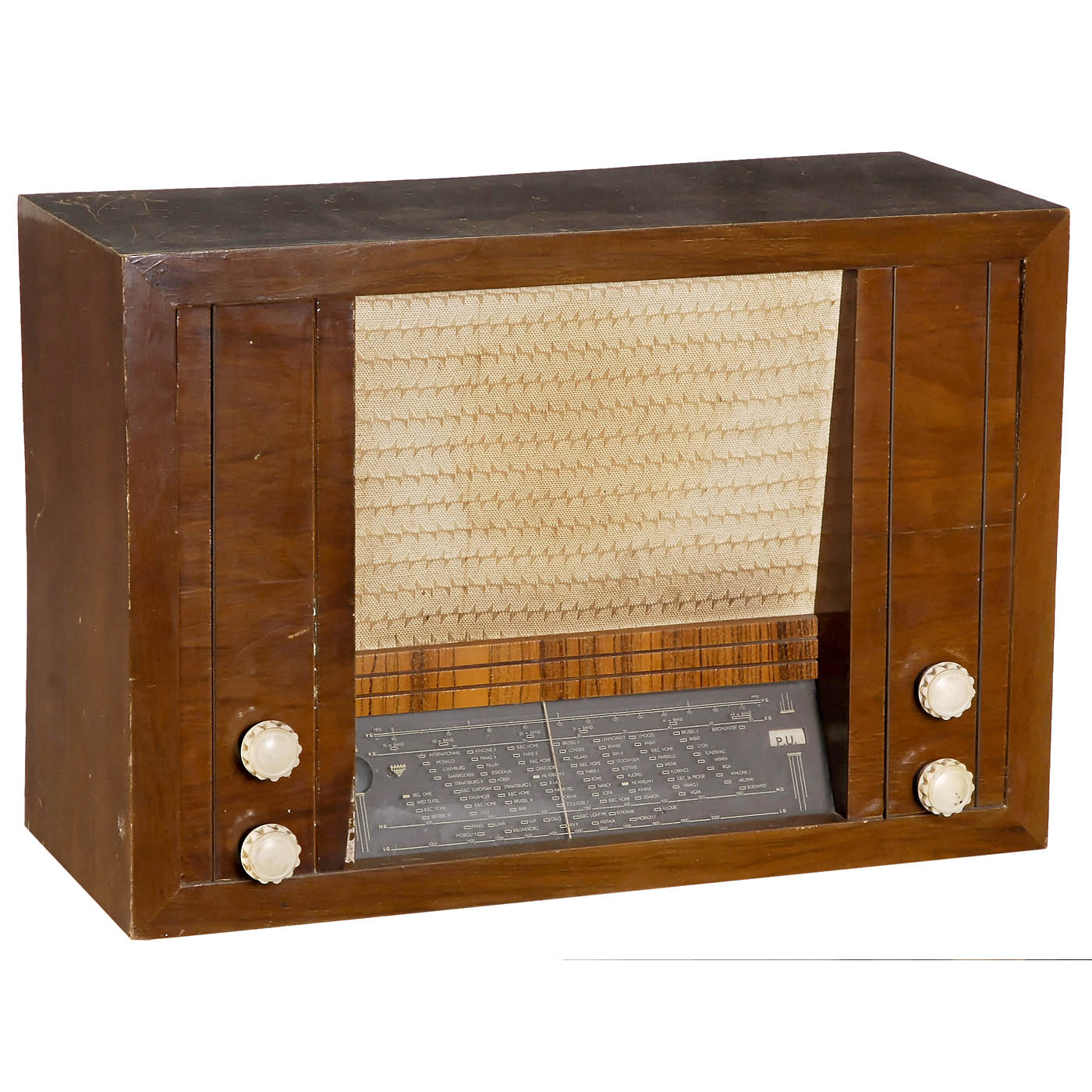 1) Telefunken Concertino 55, 7 tubes, 4 wave ranges, 1955. - 2) Philips BX 360A, 4 tubes, post-war low-cost radio, in the Netherlands known as "wailing wall", 1946. - 3) Philips 990X, 8 tubes, 2 loudspeakers, station keys, a deluxe Dutch model, 1940. - 4) Amroh MK4350, Dutch kit radio, 6 tubes, 1950. - 5) Fridor 524, Den Haag, 6 tubes, 1951. - And: 6) Erres KY457, Den Haag, 5 tubes, c. 1950.