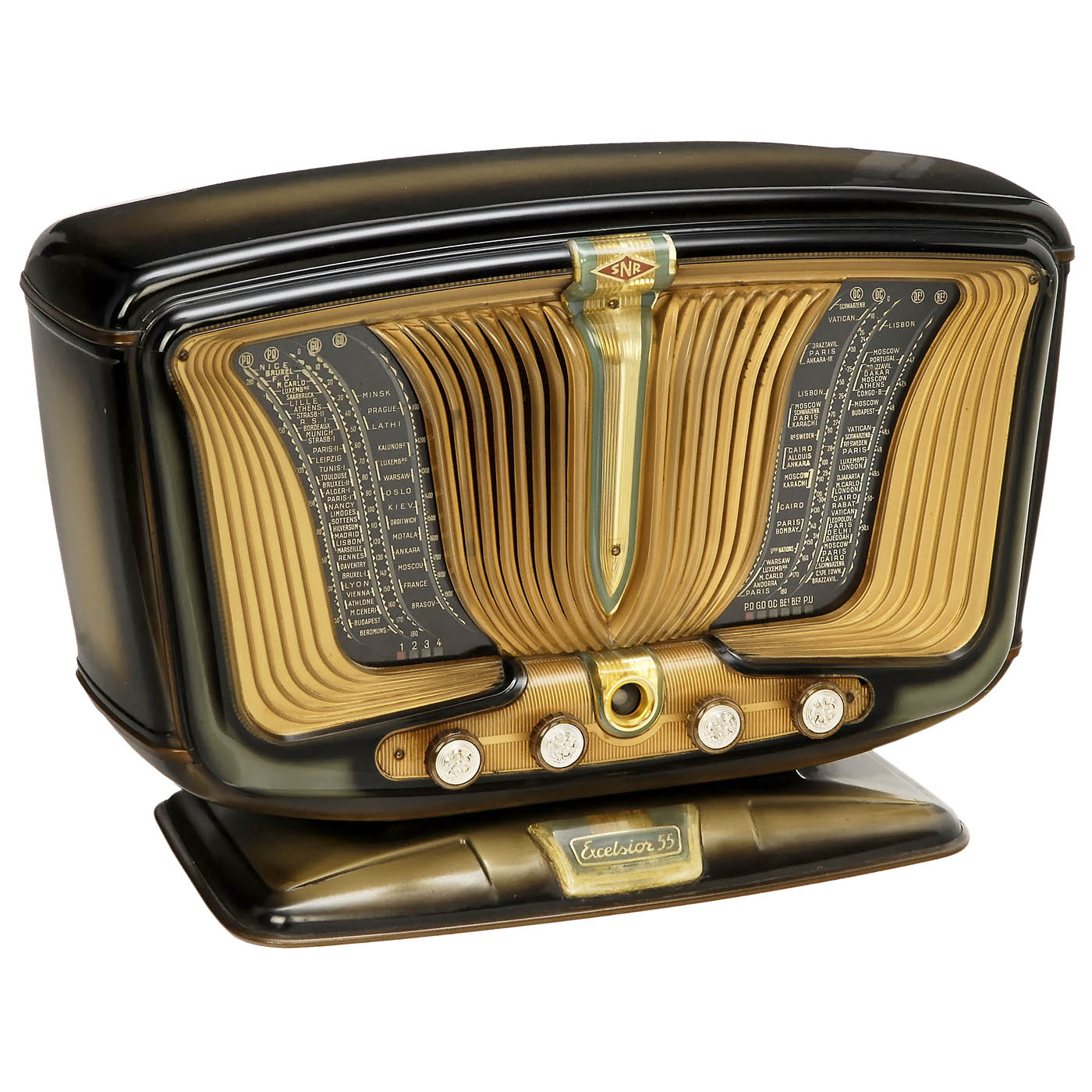 By S.N.R., Société Nouvelle de Radiophonie, Paris. 6 valves, 3 wave ranges, mains-powered, 2 integral loudspeakers, metal case, front in butterfly-style. A very sought-after design, working condition but not guaranteed.