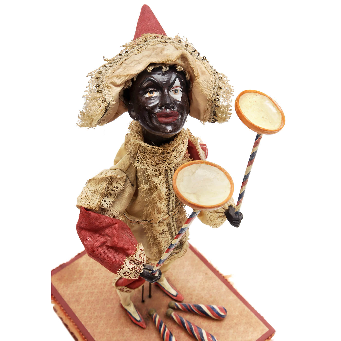 Germany. Figure in traditional Sonneberg style, using a mixture of old and newer parts, with bisque character head, carved lower limbs. The juggler is balancing a pair of turned wood plates upon spirally-painted batons, dressed as a jester in two-colored costume trimmed with lace and looped braid. On paper-covered base containing single-air cylinder movement that causes the figure to turn from side to side as he attempts to keep the wobbling plates aloft, ht. 13 ¾ in. (35 cm), chip on neck - covered by lace collar. A charming mechanical toy in good working condition.
