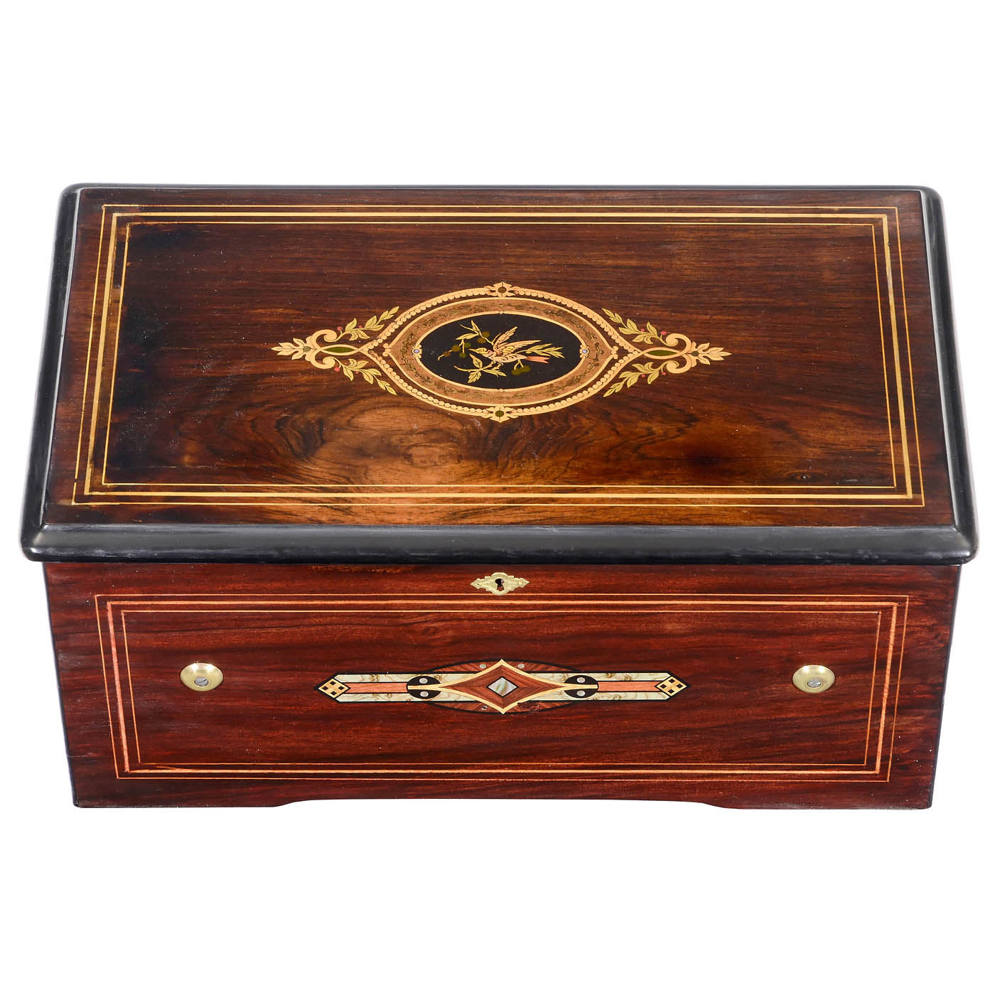 No. 15560, playing six mainly dance airs (Gamme no. 19659), including a march, a gallop and a waltz, accompanied by five optional bells with finial strikers, with 102 teeth (two treble teeth and approx. six tips replaced), tune-sheet, grained case with transfer-decorated front and veneered lid with bird inlay, wd. 20 ¾ in. (53 cm), cylinder 10 ¾ in. (27,5 cm). Good restored playing condition, lively arrangements and bright tone.