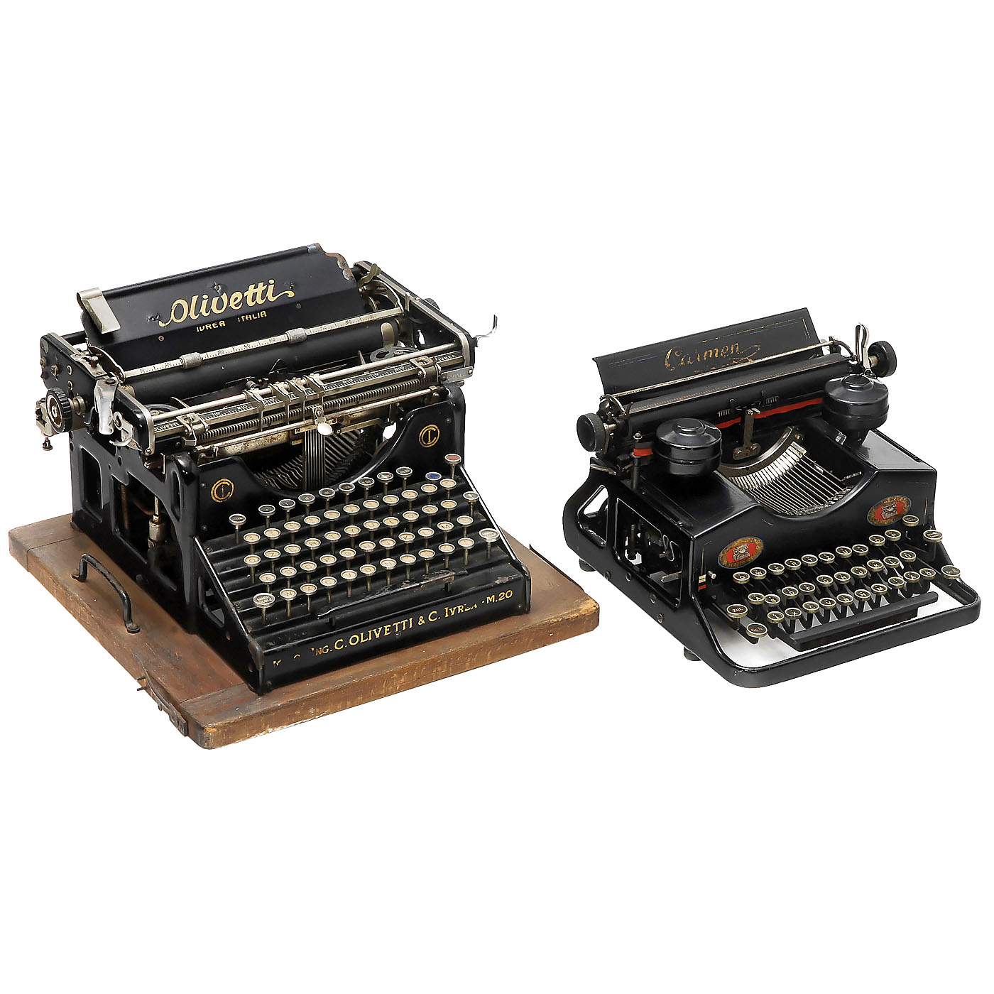 1) Titania 3, no. 7401, Mix & Genest, Berlin, 1913 onwards. (3/4) – 2) Olivetti M-20, no. 54466, Camillo Olivetti, Ivrea, Italy, 1920 onwards. (3/3) – 3) MAP, no. 103241, Société des Machines à Écrire, France, c. 1920. (3/3) – And: 4) Carmen, no. 6615, Carmen Werk A.G., Stuttgart, 1920 onwards. (3/4)