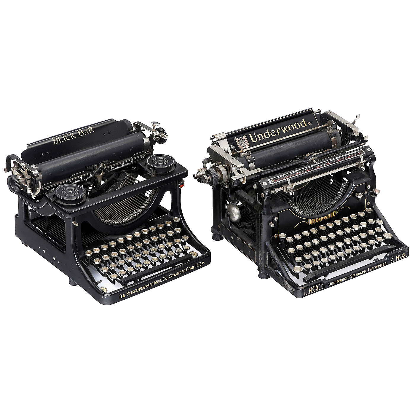 1) "Remington Standard Typewriter No. 2", 1892, serial no. 83035, upstroke machine, wood typebars, with wood roll and paper table. (3–4/4) – 2) "Blick Bar", 1916, The Blickensderfer Mfg. Co., Stamford. First typebar machine by this maker, one of only a few made. (2–3/3–4) – 3) "The Fox No. 10", 1904, Fox Typewriter Company, Grand Rapids, upstroke machine, no. 7681. (3–4/3–4) – And: 4) "Underwood No. 5", c. 1905. (3–4/3–4)