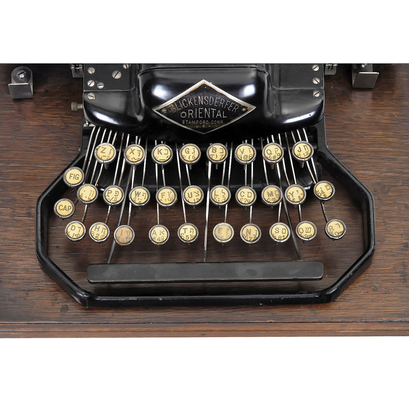 Model 8, no. 147861, Stamford, Connecticut, USA, type cylinder, downstroke, three-row keyboard, double shift, with lever to switch the carriage direction. Latin and Hebrew keyboard.