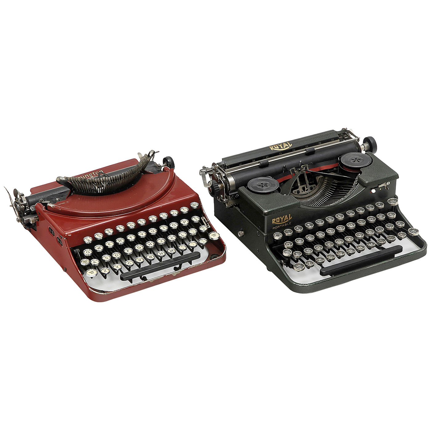 1) "Royal", 1928, Royal Typewriter Company, New York. Green crackle finish, no. P43370. – 2) "Remington Premier", 1938, Remington Rand, USA. Black, no. P156047. – 3) "Royal Quiet De Luxe", c. 1950, Royal Typewriter Company, New York. Pink, no. Ap3288125. – 4) "Remington Performer", 1981, Sperry Rand, Japan, white, no. J1689512. – 5) "Remington Envoy", 1941, Remington Rand, USA. Black, no. S-1193163. – And: 6) "Remington Portable No. 2", 1921, USA. Folding typebar mechanism, red, no. NL87298.