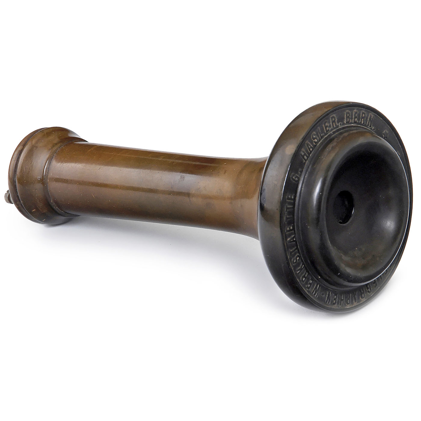 Marked: "Telegraphen Werkstaette G. Hasler Bern". Butterstamp telephone, bakelite, brass contacts, for speaking and listening, height 7 ½ in.