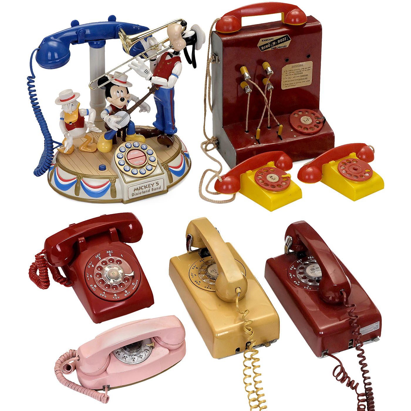 1) Bell-System "Princess", for the boudoir. – 2) ITT 228A rotary-dial wall telephone, beige. – 3) Northern Telecom SQM500AX, Canada, red. – 4) Western Electric 554BMP, rotary-dial wall telephone, red. – And: 5) Telemania "Mickey's Dixieland Band Telephone". – In addition: Toy telephone "Kamkap's Ring'n'Buzz" Switchboard.