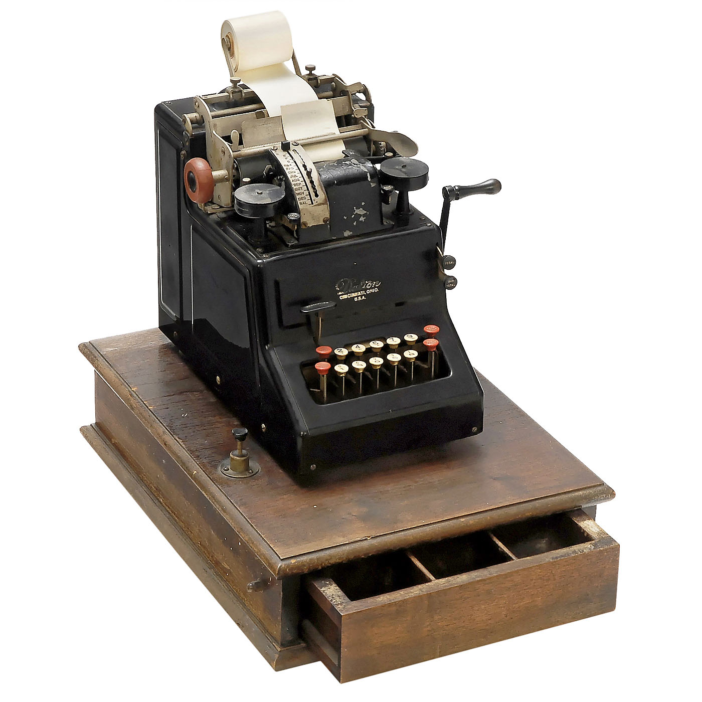 1) Dalton cash register with Ikland drawer, c. 1920, Dalton Adding Machine Company, Cincinnati, USA. Mechanical, with date setting register and printer, on wood base with drawer, working. – And: 2) Dodge Cash Register Model II, c. 1900, serial no. 526, manufactured by Dodge Cash Register Company, Los Angeles. Wood case, marble writing plate, coin compartment, drawer for banknotes, 2 bells with different tones, size only 14 1/5 x 12 ¼ x 13 ¾ in. When the lid is pulled up, the cash drawer opens and the indicator in the top window rotates from "Thank You" to "Call Again". Working.