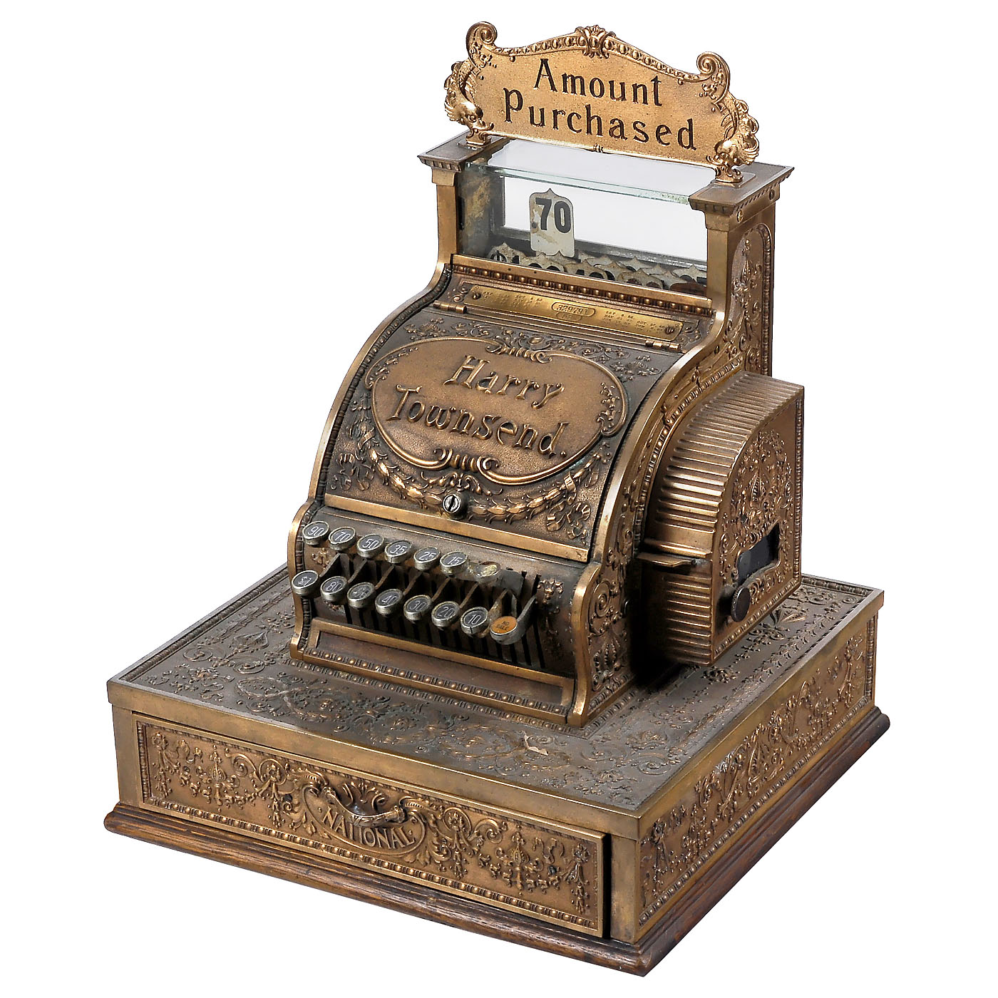 Barber shop cash register, serial no. 329791, manufacturer: National Cash Register Company, Dayton, Ohio. 15 amount keys in 2 rows, for American currency, total adder, bronze case, top sign renewed, good working condition.
