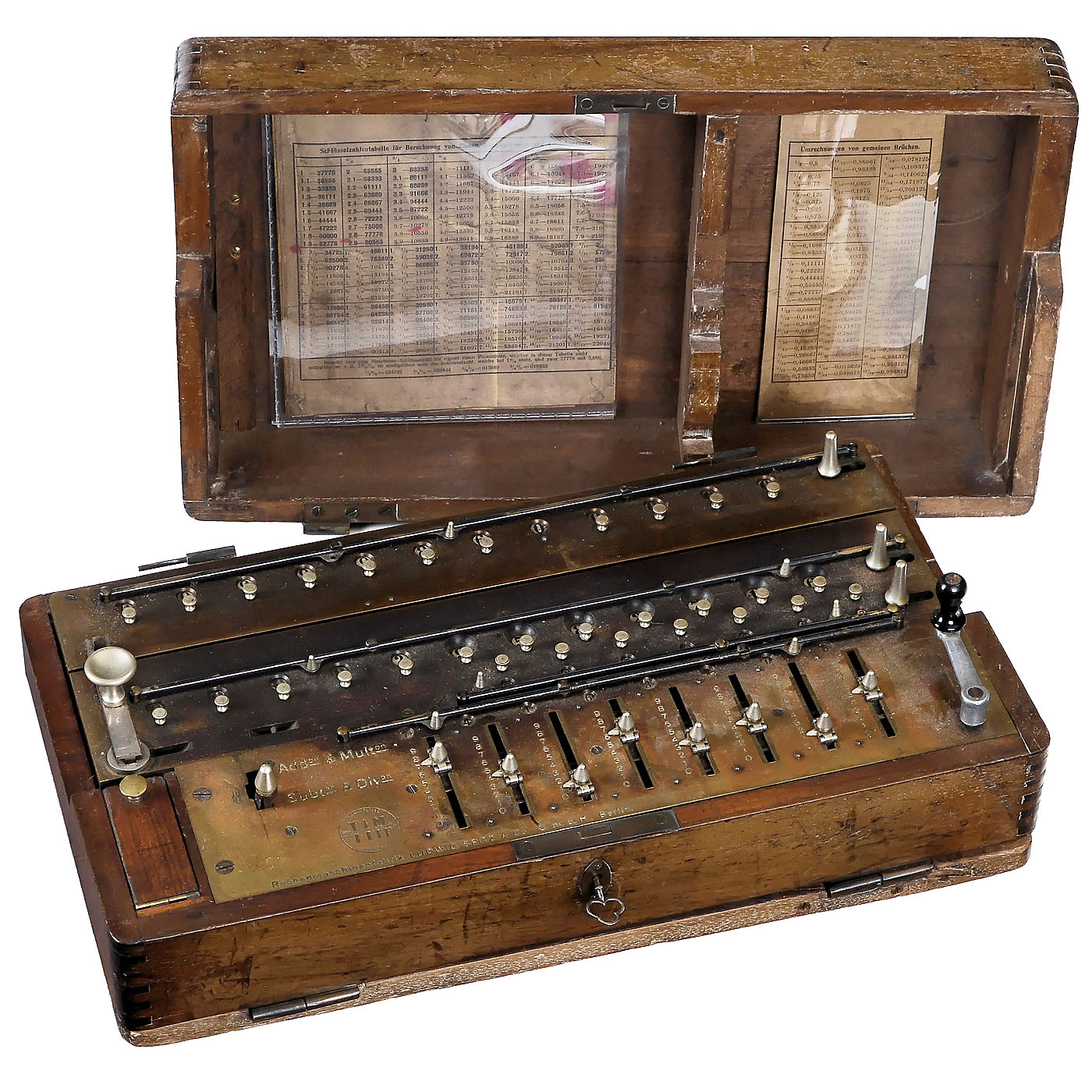 Early lever-set stepped-drum calculator with double-result sled, 2 x 12, 7 and 8 digits, manufactured by Ludwig Spitz & Co, Berlin. Low serial no. 394! Tilting oak case. – Literature: Martin, p. 206. – Highly interesting collector's item and exhibition piece! Working.