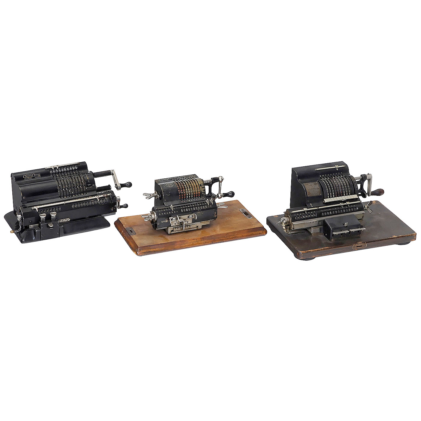 1) "Brunsviga Midget", c. 1920, made by Grimme & Natalis, Braunschweig, Germany. Serial no. 67718, spoked-wheel machine, 9, 8 and 13 digits, marked "Midget" for the American market, working. (2–3/2) – 2) "Marchant Pony Model A", c. 1915, no. 941, USA, spoked-wheel machine, mechanism partially sticking. (2–3/3–4) – 3) "Marchant XL", c. 1925, no. 96255, adaptive segment mechanism, working, mechanism a bit stiff. (3/3) – 4) "Burroughs Model 520", c. 1912, no. 207150, construction similar to the Comptometer, reset lever loose. (2–3/3–4) – And: 5) "Original-Odhner 39", c. 1940, no. 288319, spoke-wheel machine, mechanism sticks. (3/4)