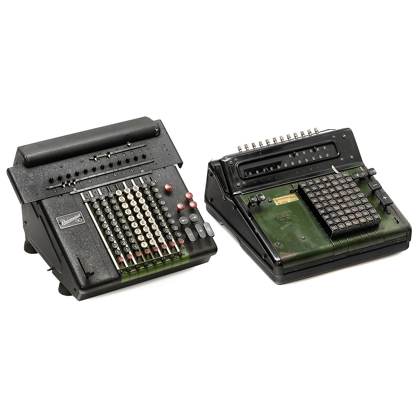 1) Mercedes-Euklid, model 30, Germany, serial no. 226. – 2) Burroughs Comptometer, England, serial no. C80993S. – 3) Rheinmetall, Germany, serial no. 57290. – And: 4) Numeria, model 8213, Italy, serial no. 52928. – All untested.