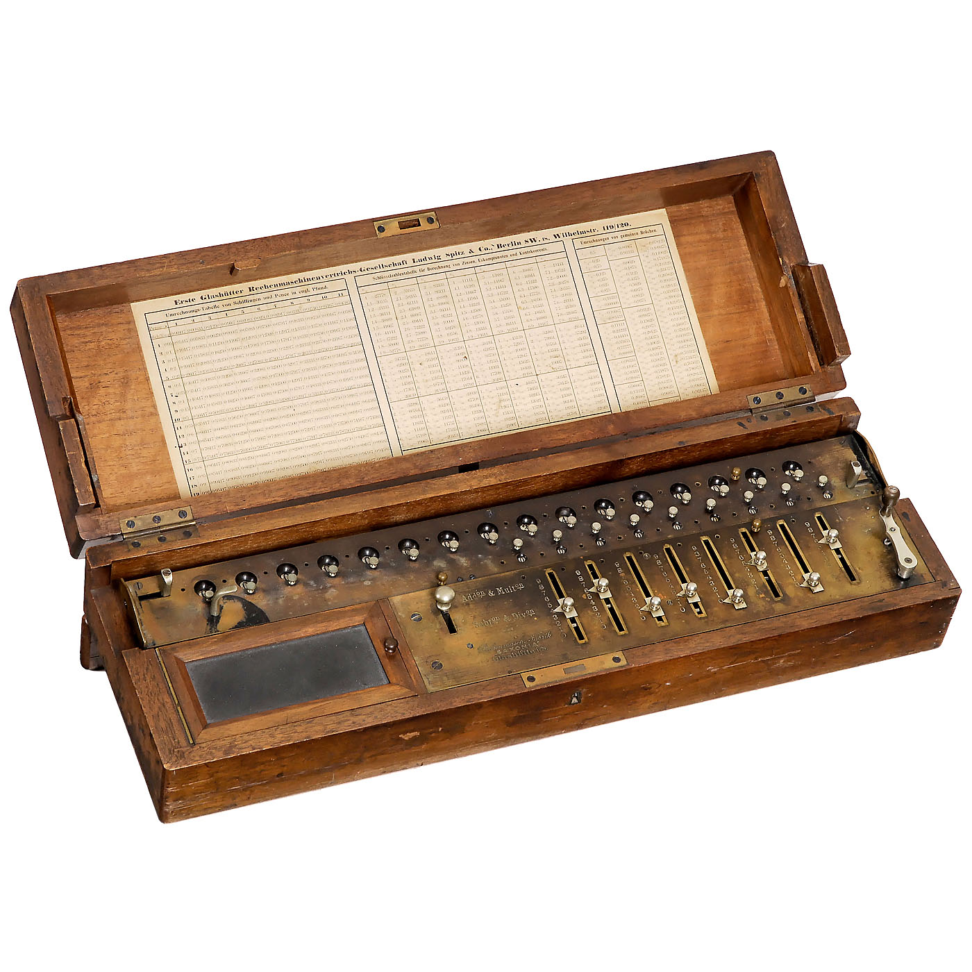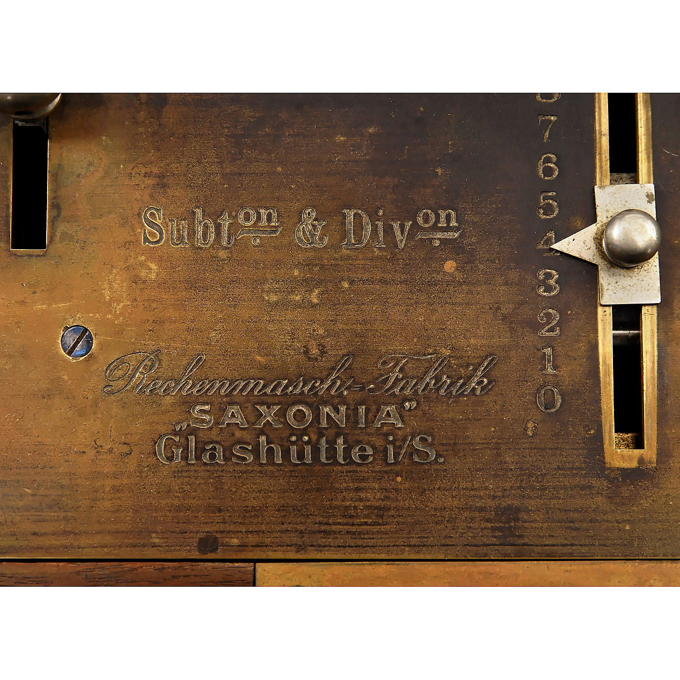 Exceptionally rare German stepped-drum calculating machine by Rechenmaschinen-Fabrik Saxonia, Glashütte i./S., mahogany case with rear-mounted desk-type feature. Serial no. 8444 on case. – Literature: Martin, p. 133. – A superb collector's item and exhibition piece!
