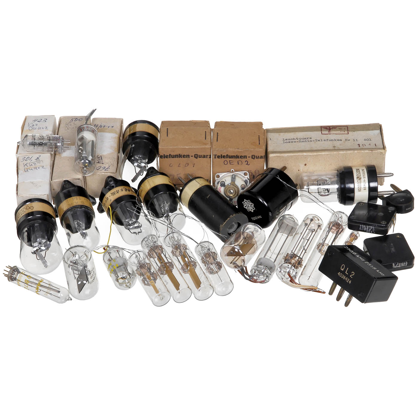 29 tubes for Wehrmacht radio equipment: illuminated quartz, oscillating quartz, double quartz and other crystals by Telefunken, Tesla, Loewe-Opta. Various frequencies, some with German eagles. Most are new and unused. - In addition: 18 modern small quartz crystals.